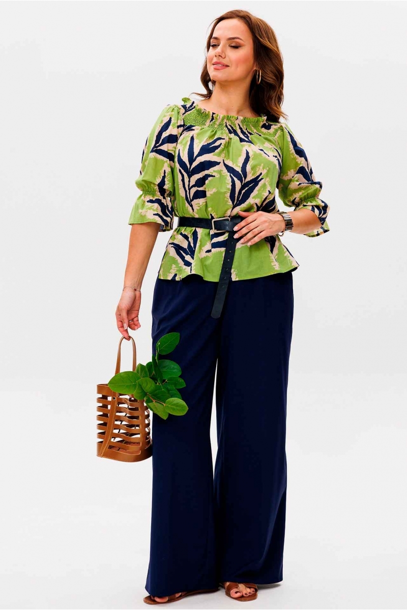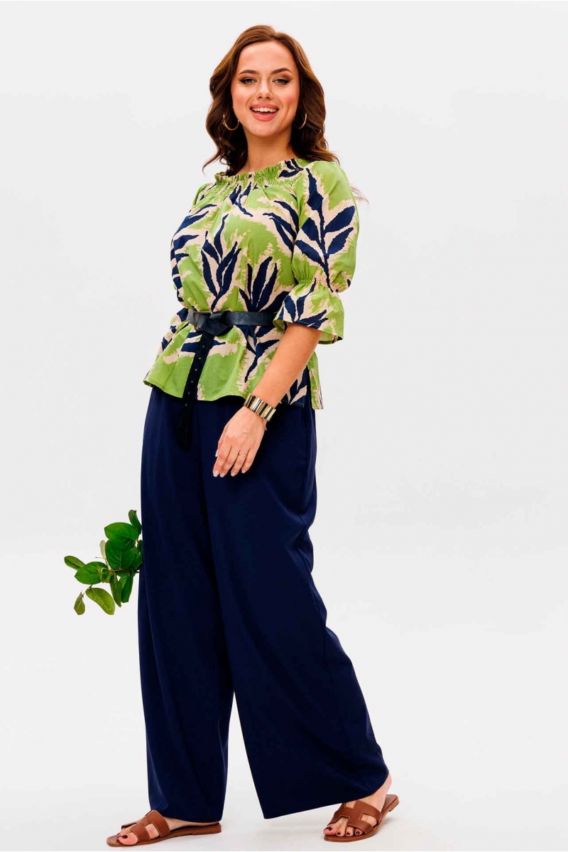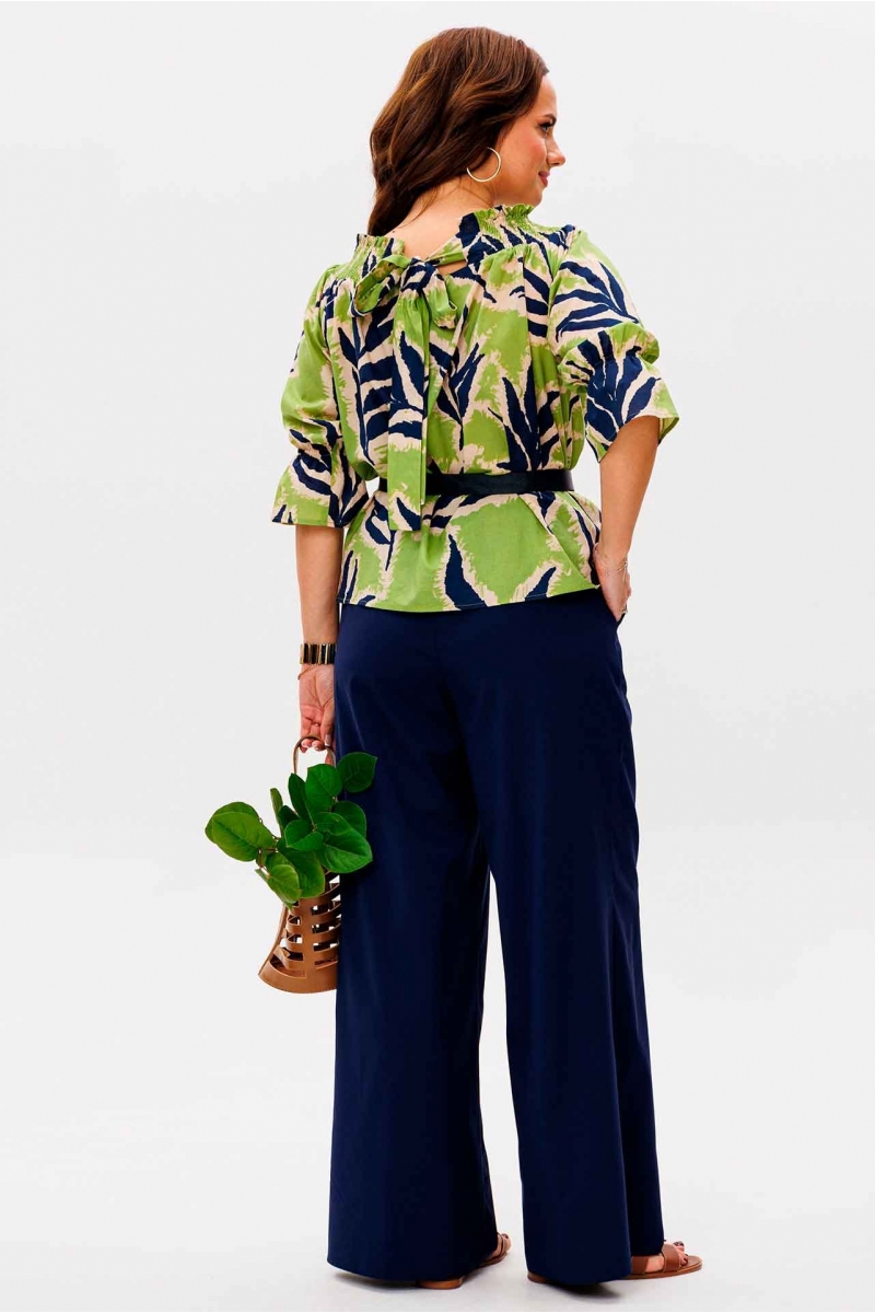 Костюм женский, состоит из блузы и брюк. Блуза прямого свободного силуэта из хлопка, рукав 3/4. Низ рукава собран на резинку-венгерку, и образует красивый волан. По бокам блузы разрезы. По верху блузы притачная планка, собранная на резинку-венгерку, на спинке планка завязывается на бант. Брюки на резинке, свободные, прямые, с карманами в боковых швах.