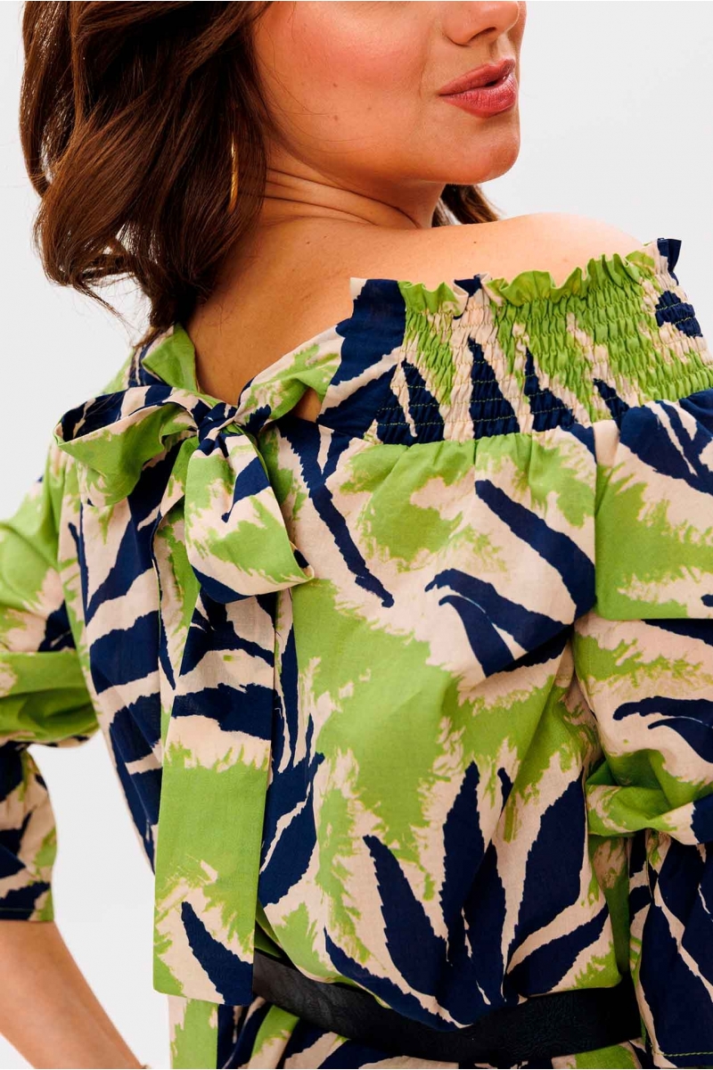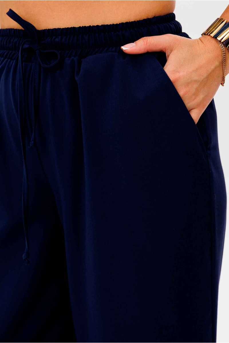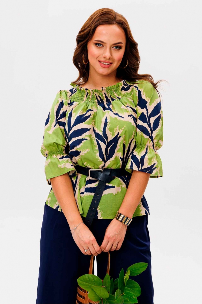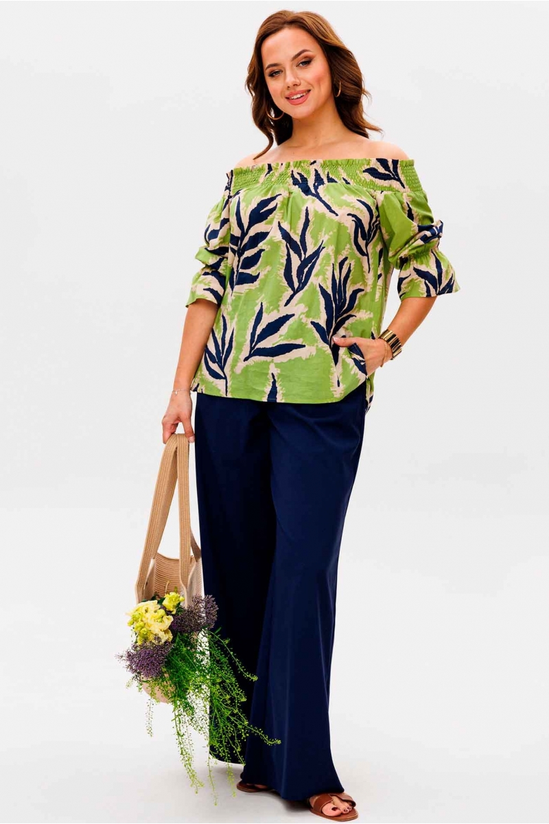 Костюм женский, состоит из блузы и брюк. Блуза прямого свободного силуэта из хлопка, рукав 3/4. Низ рукава собран на резинку-венгерку, и образует красивый волан. По бокам блузы разрезы. По верху блузы притачная планка, собранная на резинку-венгерку, на спинке планка завязывается на бант. Брюки на резинке, свободные, прямые, с карманами в боковых швах.