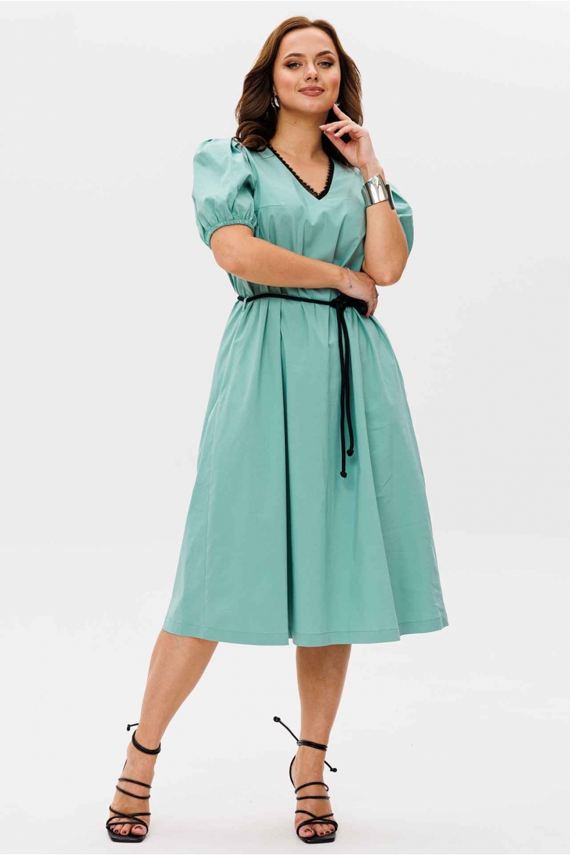 Платье женское А-силуэта выполнено из летнего хлопка содержащей плательной ткани. По переду нагрудные вытачки. Горловина V-образная, украшена контрастным кружевом. Спинка с центральным швом. В боковых швах карманы. Рукава одно шовные втачные со складками по окату и сборкой на резинку по низу. Платье без подкладки. Дополнением служит пояс-шнур.