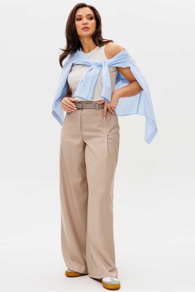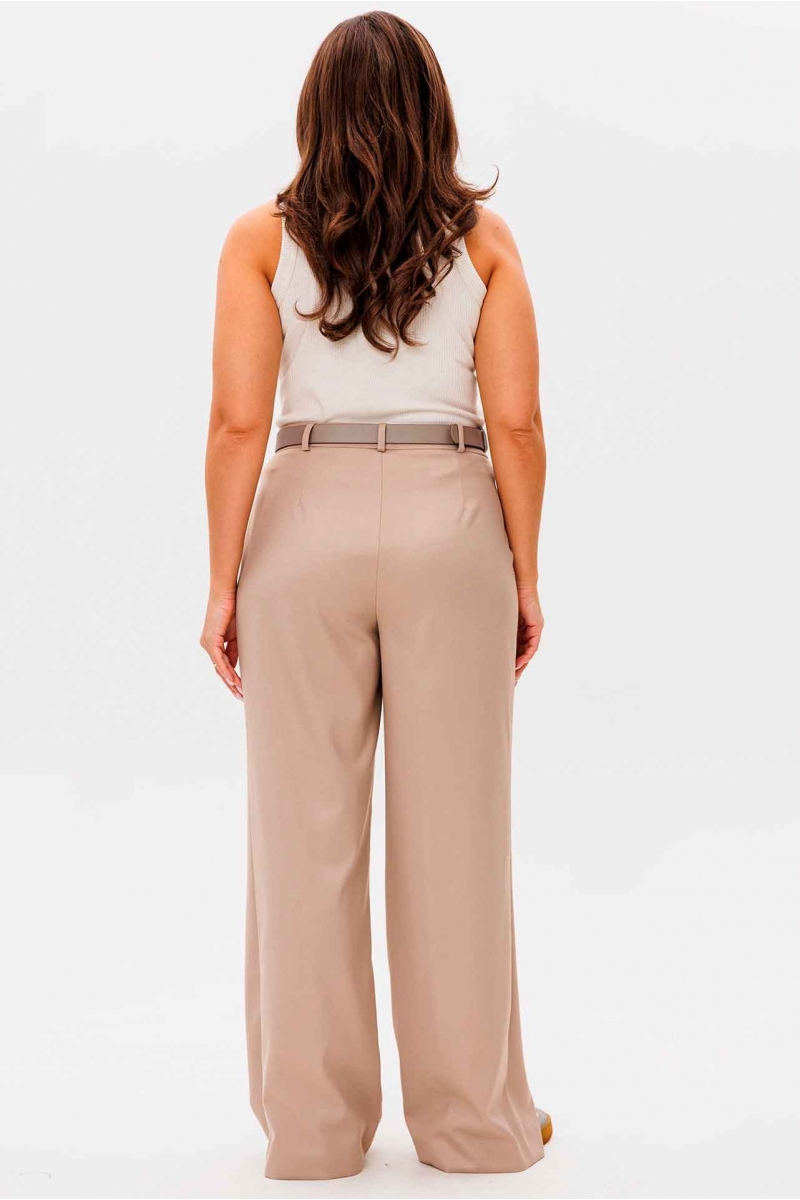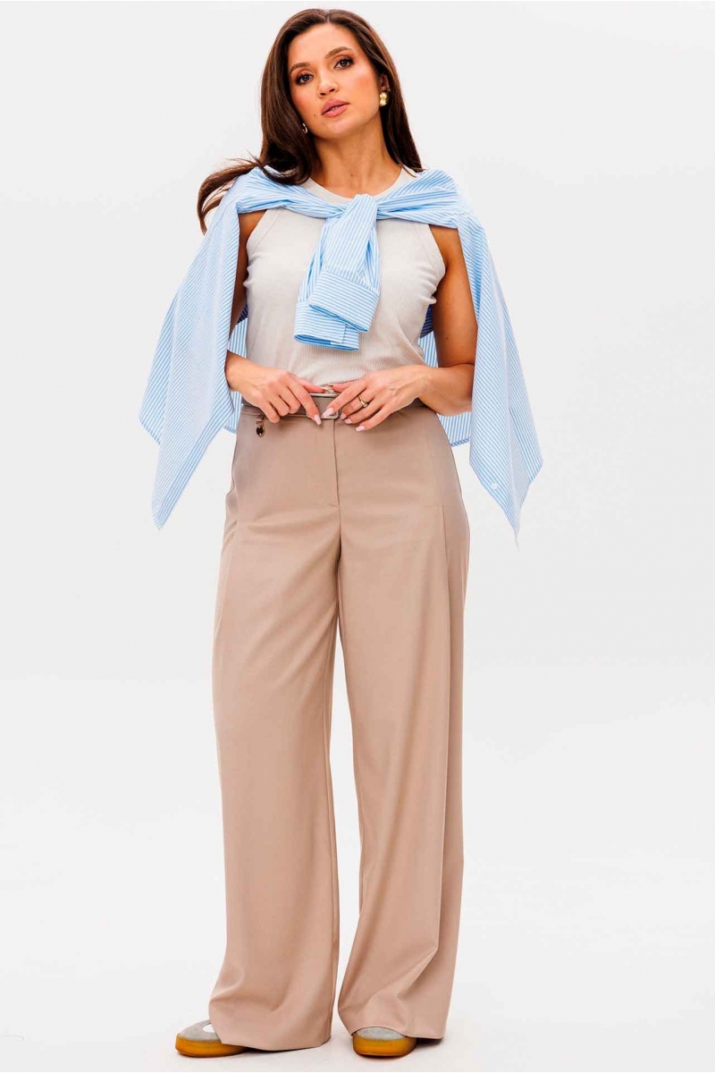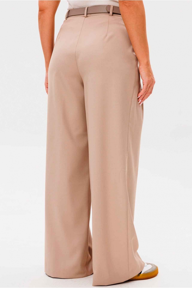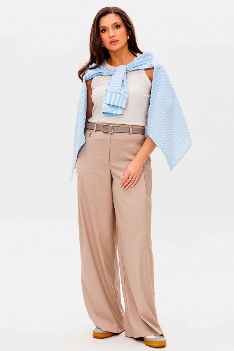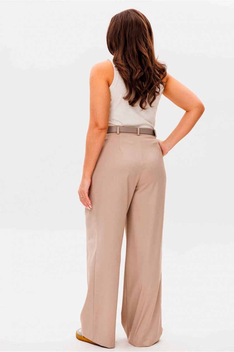 Брюки женские свободного силуэта с высокой посадкой, максимальным расширением от бедра (палаццо). Брюки на притачном поясе. По переду складки в центрах половинок брюк и застёжка на молнию с гульфиком и откоском. Талевые вытачки по задним половинкам брюк.