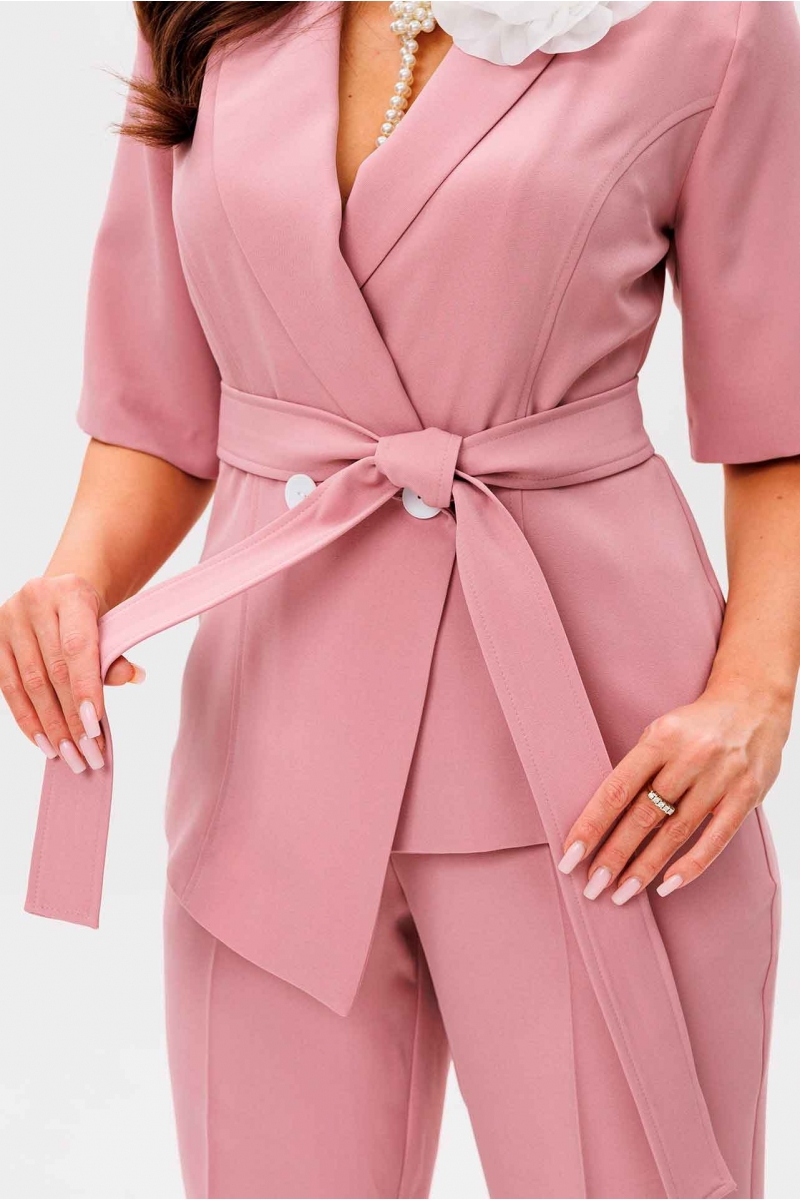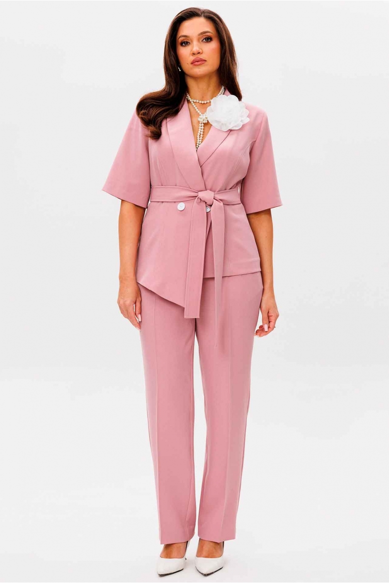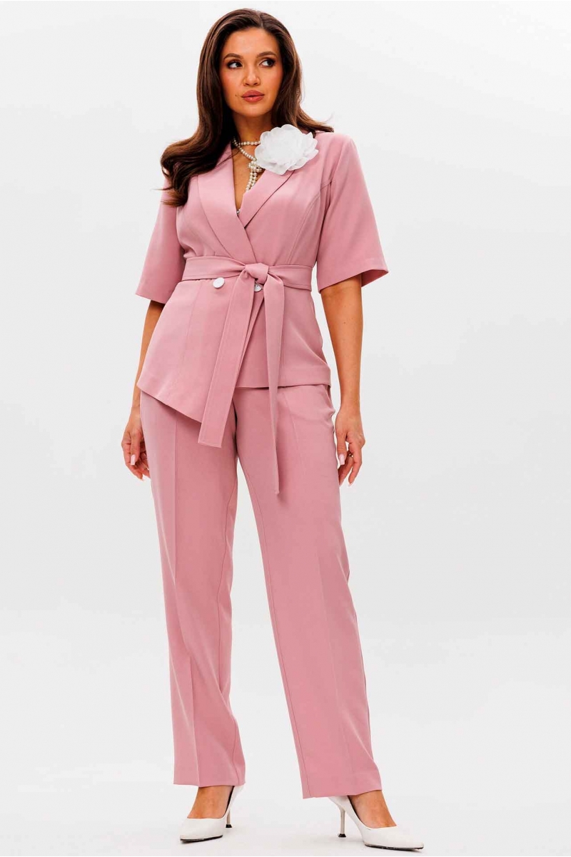 Женский брючный костюм, состоящий из жакета и брюк. Жакет полуприлегающего силуэта, двубортный, с застежкой на две пуговицы. Воротник английский. Рукав втачной, длиной до локтя. По бокам рельефные швы, формирующие силуэт. На уровне груди предусмотрены нагрудные вытачки. Украшает модель съемный декоративный цветок. Брюки прямого силуэта, слегка зауженные к низу. Пояс частично на резинке (по бокам), с шлевками для ремня. Застежка на гульфик с молнией и внутренним крючком. По бокам боковые карманы с косым входом, сзади декоративные прорезные карманы «в рамку». Материал костюма костюмный, средней плотности, с гладкой фактурой. Без подкладки. Дополняет модель широкий пояс.