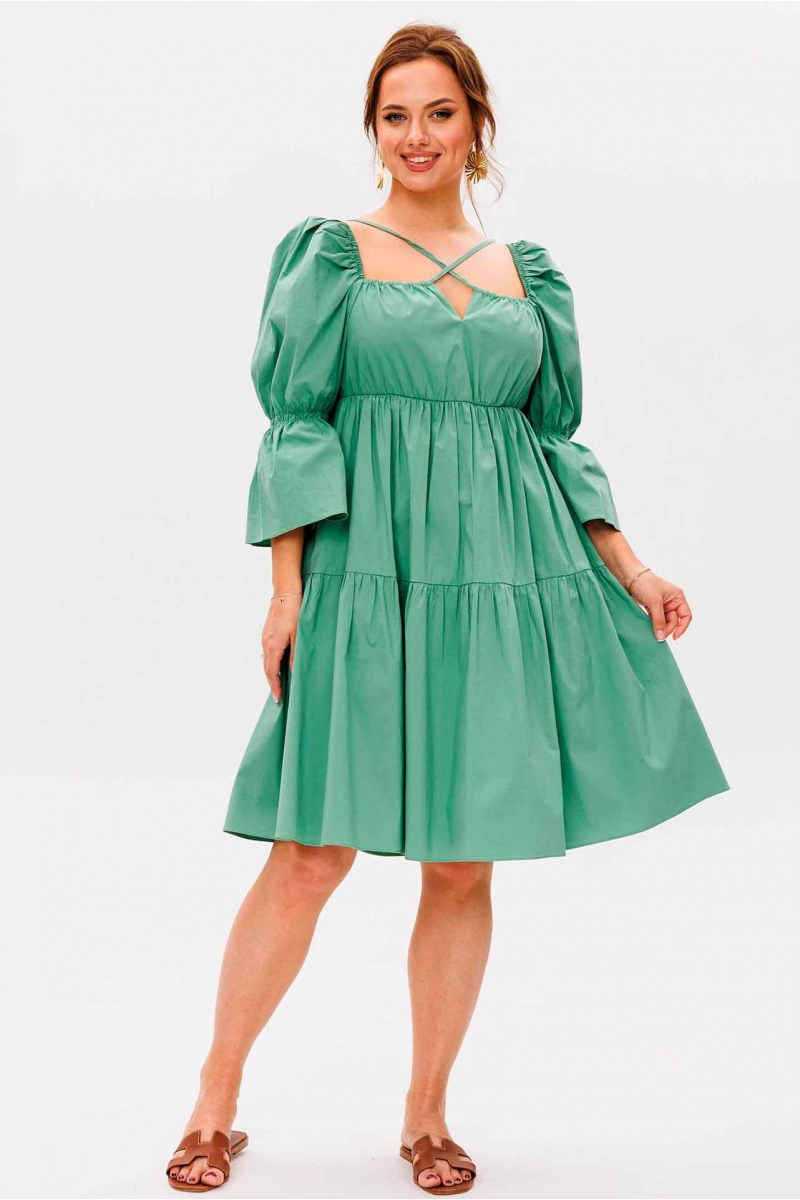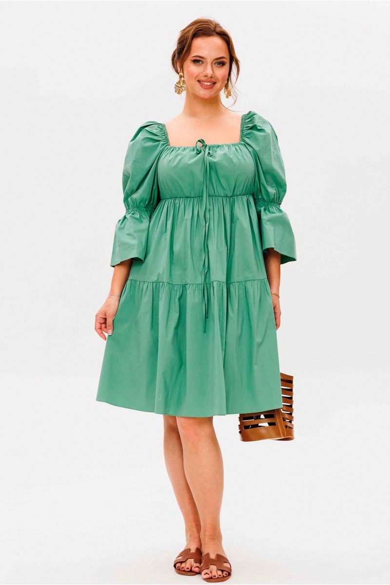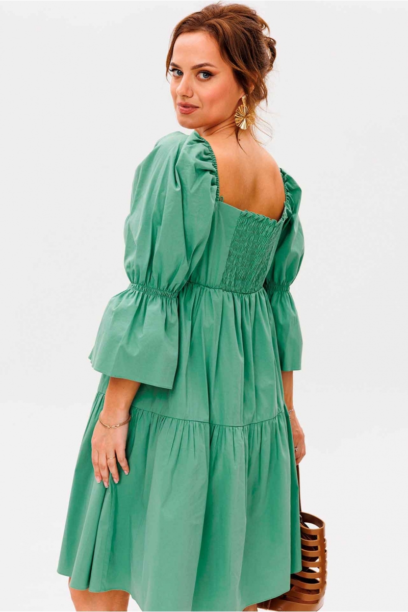 Платье женское отрезное выше линии талии, свободное. Центральная часть спинки стянута на резинку «венгерку». Горловина фигурная, регулируется завязками. Окаты рукавов стянуты на тонкую резинку. Рукава одношовные втачные, на уровне локтевого сгиба рукав стянут резинкой «венгеркой». Платье без подкладки.