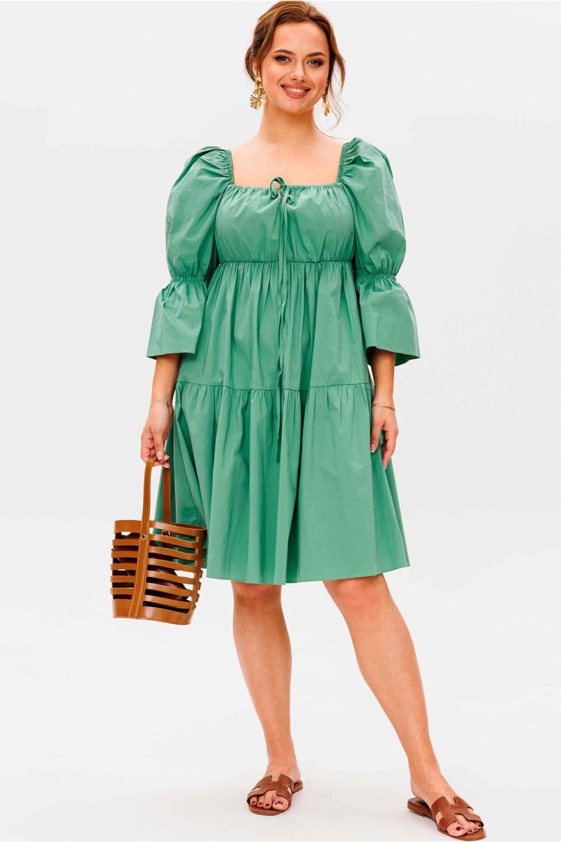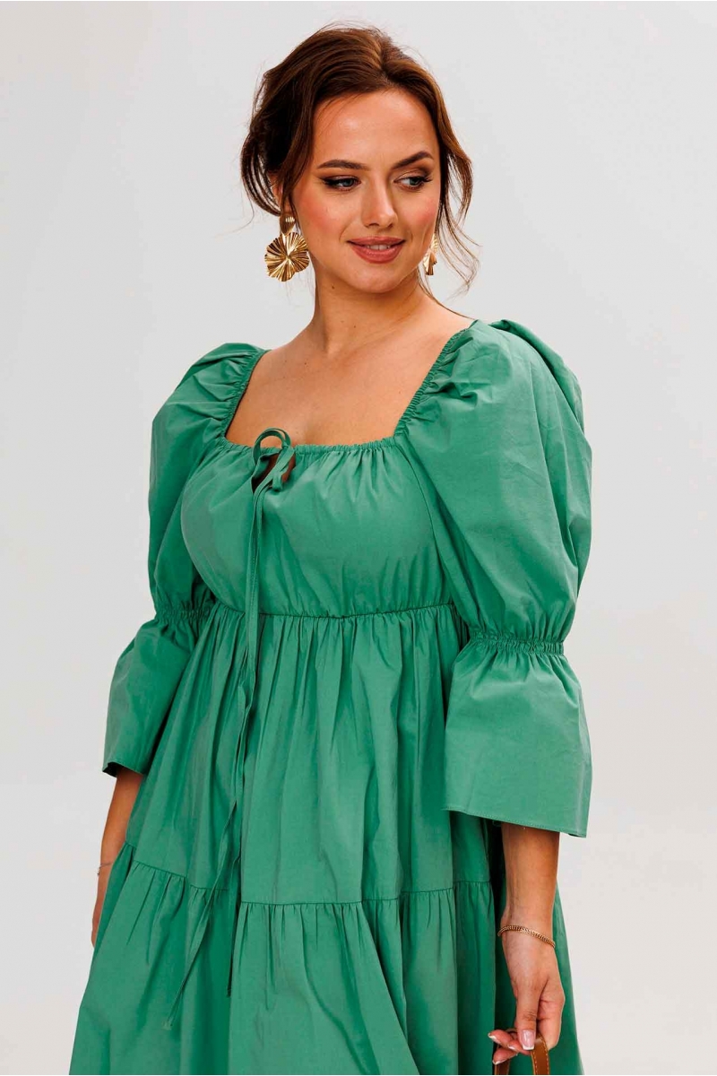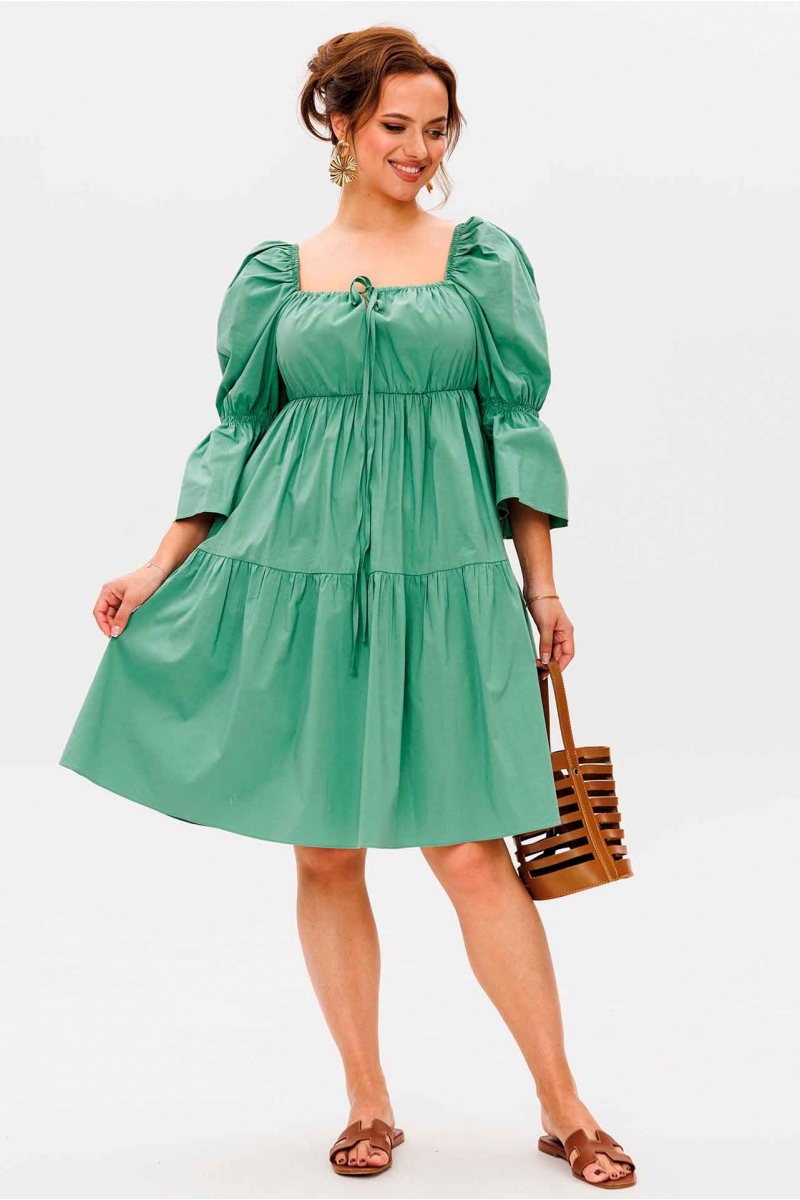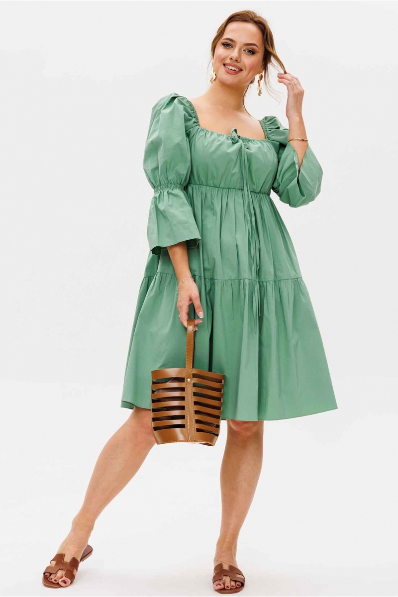 Платье женское отрезное выше линии талии, свободное. Центральная часть спинки стянута на резинку «венгерку». Горловина фигурная, регулируется завязками. Окаты рукавов стянуты на тонкую резинку. Рукава одношовные втачные, на уровне локтевого сгиба рукав стянут резинкой «венгеркой». Платье без подкладки.