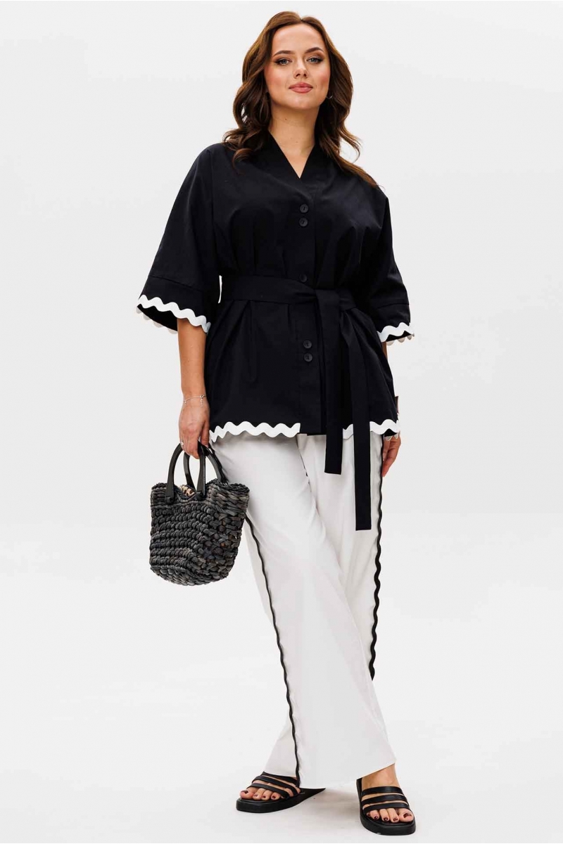 Костюм женский: свободная чёрная блуза с кружевной отделкой по низу и поясом в комплекте, в сочетании с белыми прямыми брюками — идеальный выбор для стильного образа в офис и на каждый день. Натуральные ткани, удобная посадка.