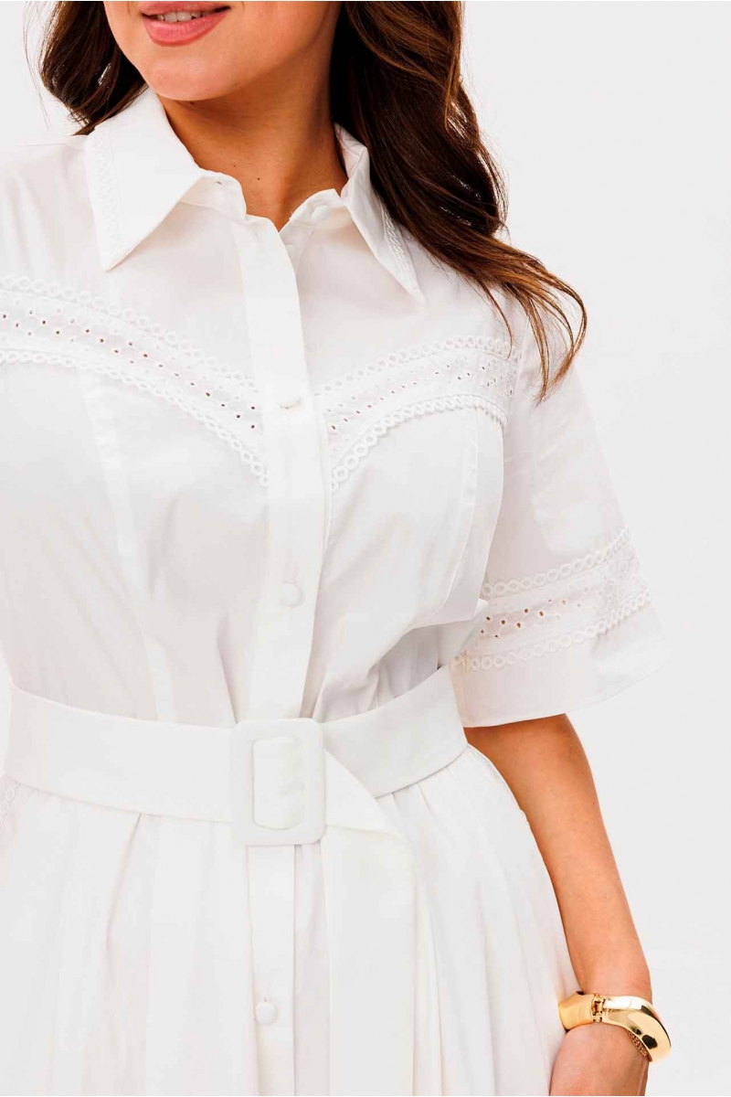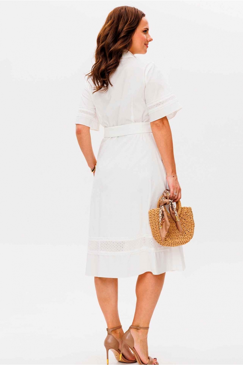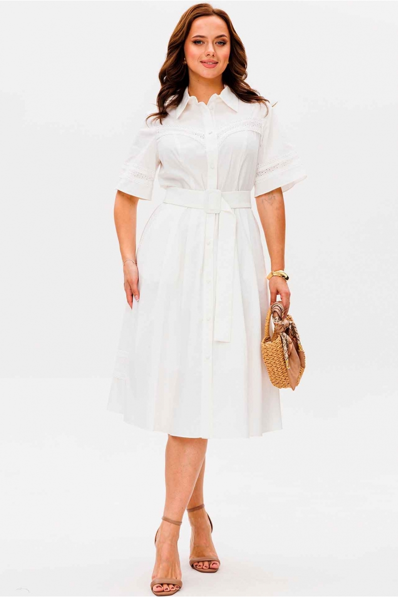 Платье полуприлегающего силуэта, отрезное по линии талии, застежка центральная (обработана притачной планкой) на петли-пуговицы. Лиф переда с фигурными рельефами. По линии талии в нижней части расположены складки. Лиф спинки с талиевыми вытачками, рукав одношовный втачной, слегка расклешенный. По нижней части спинки, рукава и по кокетке переда вставлена декоративная ткань с отделочной тесьмой. Воротник рубашечного типа с отрезной стойкой. По краю воротника и краю карманов настрочена декоративная тесьма. Платье на подкладке. Дополнением служит пояс.