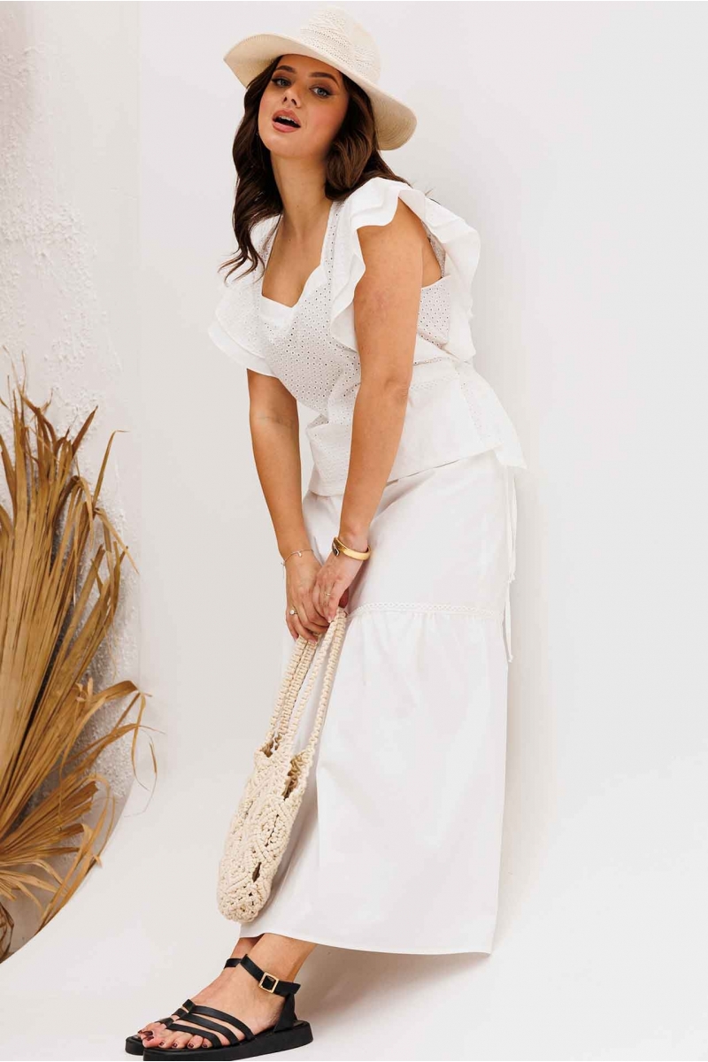 Белый хлопковый топ с двойным воланом и юбка миди на резинке. Лёгкий и воздушный комплект для лета. Натуральная ткань и акцент на женственность.