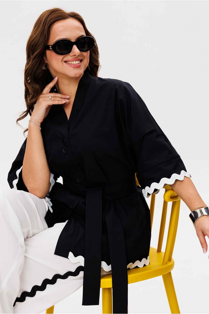 Туника с рукавами 3/4, белым кантом и поясом в комплекте. Современный силуэт и акцентная отделка делают образ эффектным и универсальным. Сочетается с белыми прямыми брюками — идеальный выбор для стильного образа в офис и на каждый день. Натуральные ткани, удобная посадка.