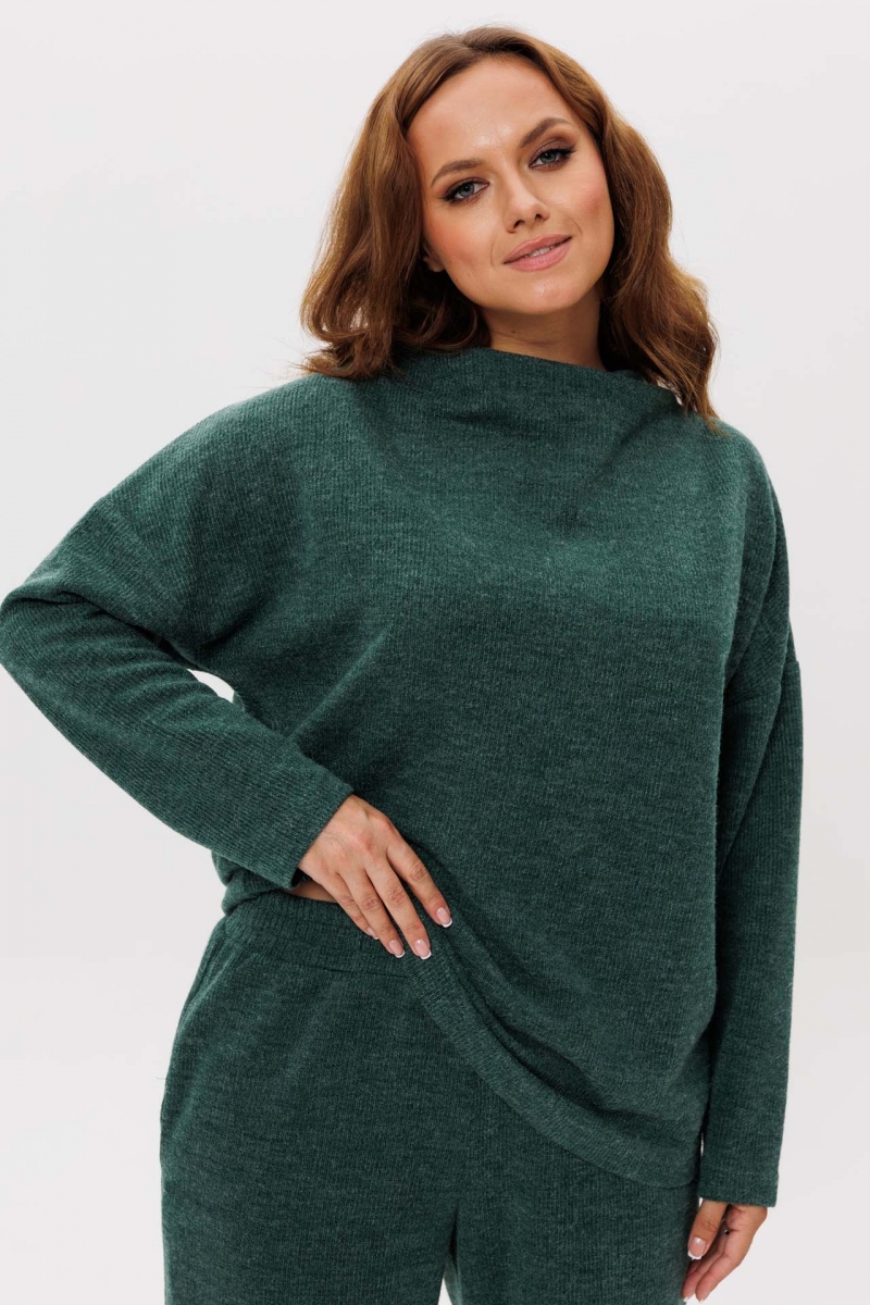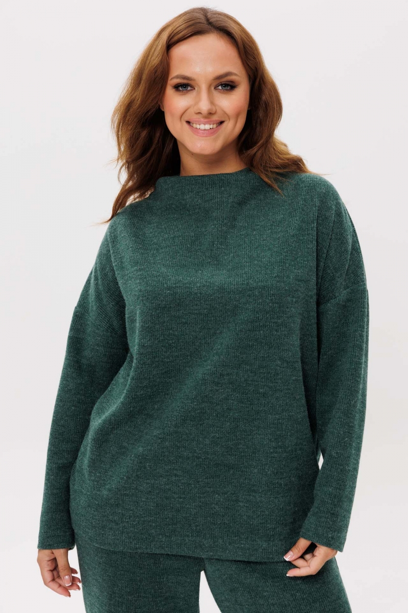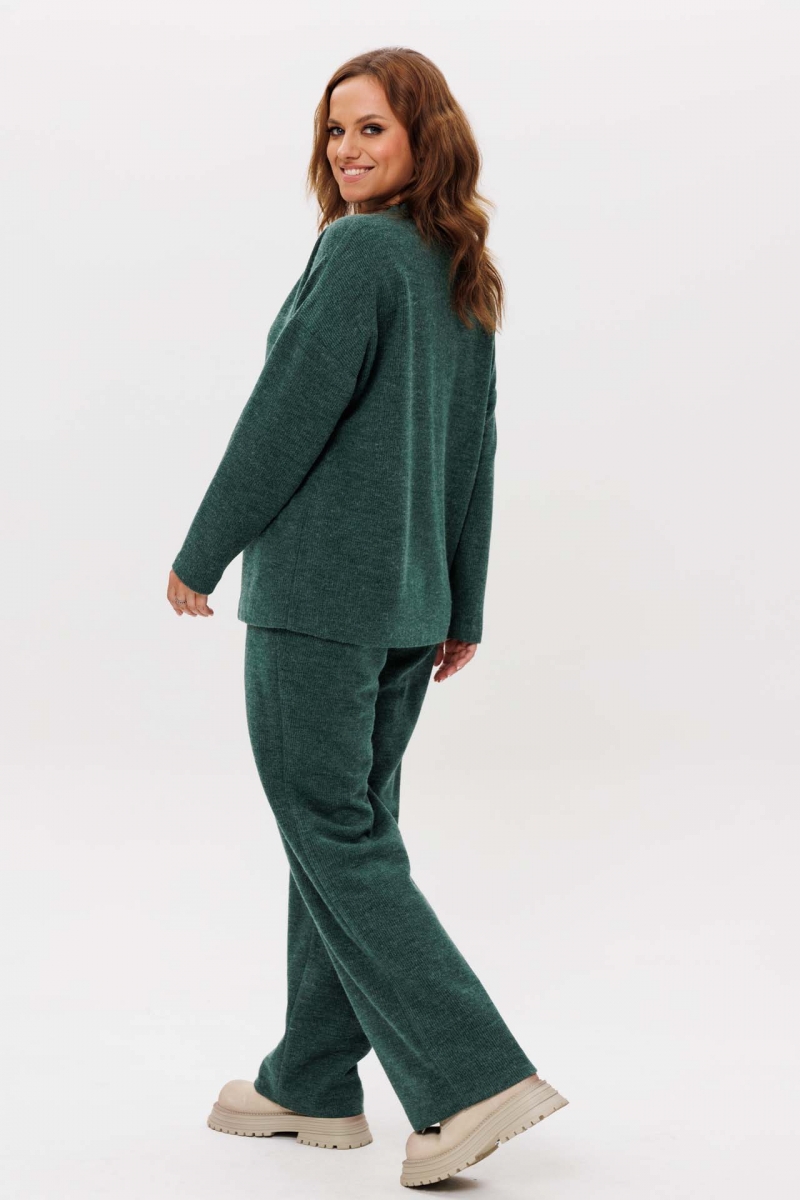 Костюм трикотажный женский состоит из джемпера и брюк. Джемпер прямого силуэта со спущенным втачным рукавом. В боковых швах обработаны разрезы. Горловина - цельнокроеная стойка. Брюки прямого силуэта. Талия обработана притачным поясом на резинке. В боковых швах - карманы.