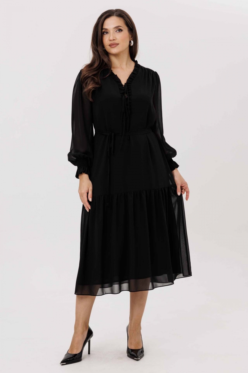 Легкое платье миди с романтичной отделкой и акцентированной талией.