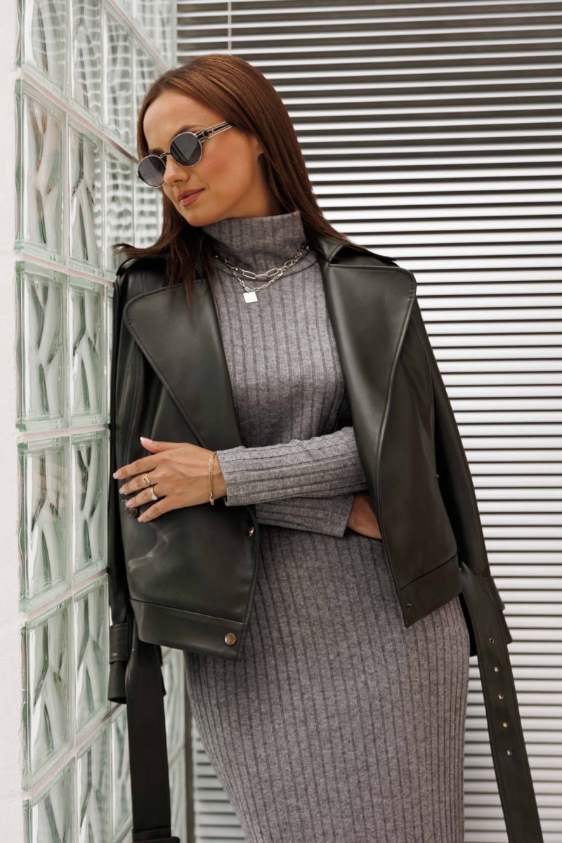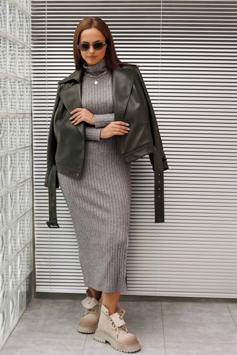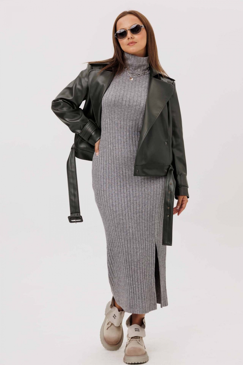 Облегающее платье в рубчик с разрезом и длинными рукавами.