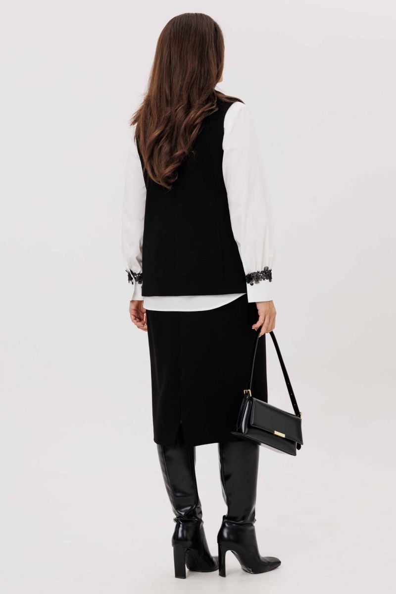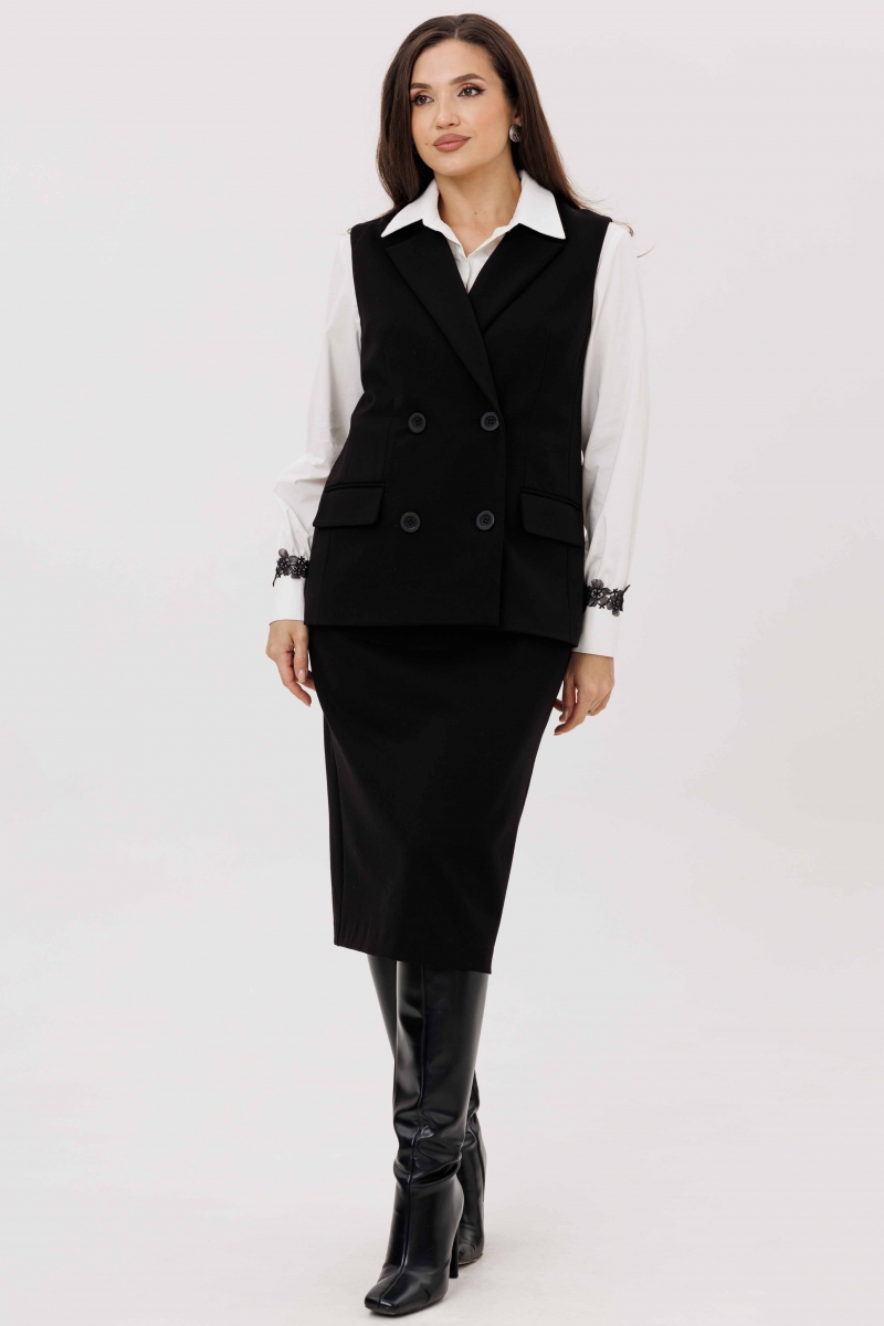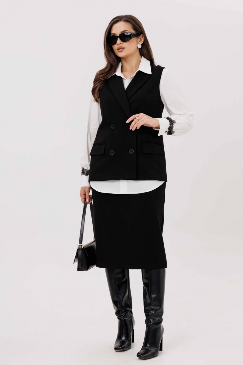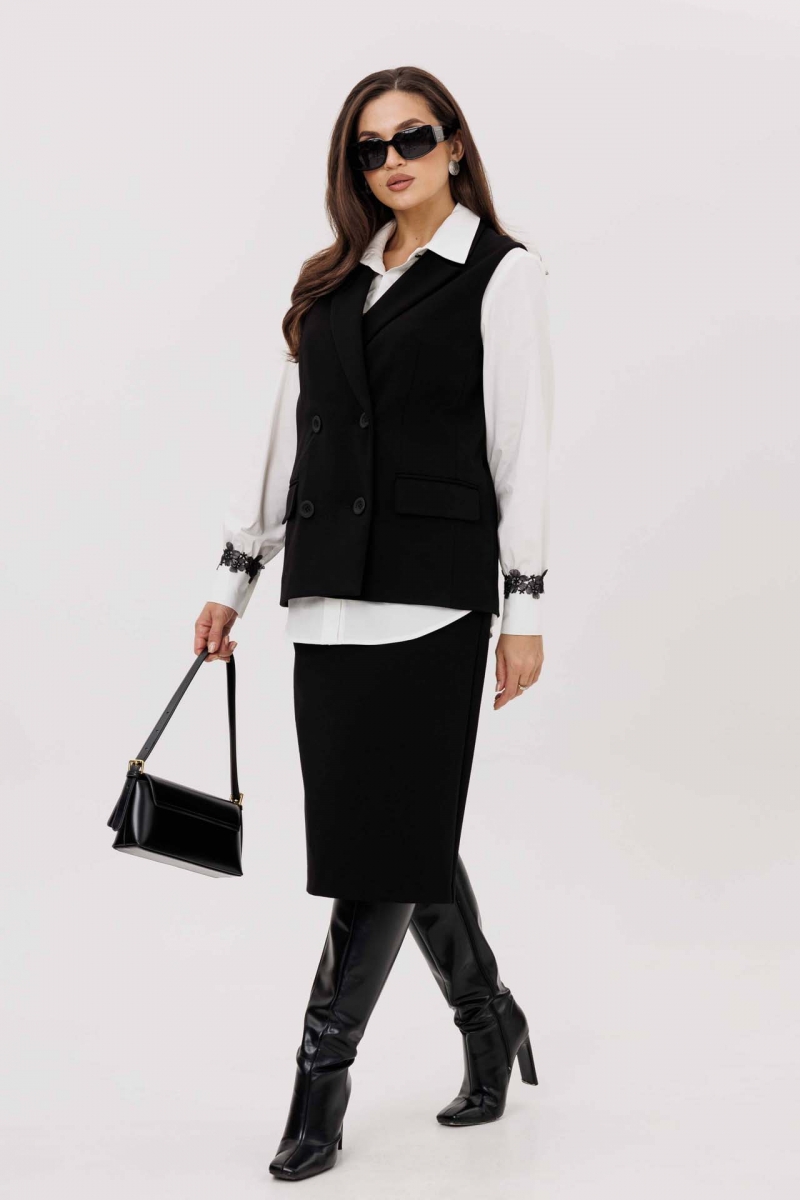 Жилет на пуговицах, приталенная юбка и белая рубашка.
