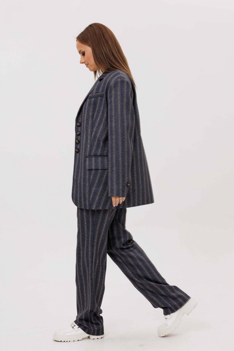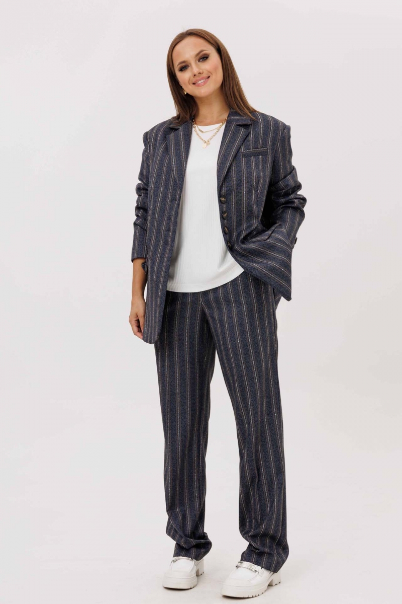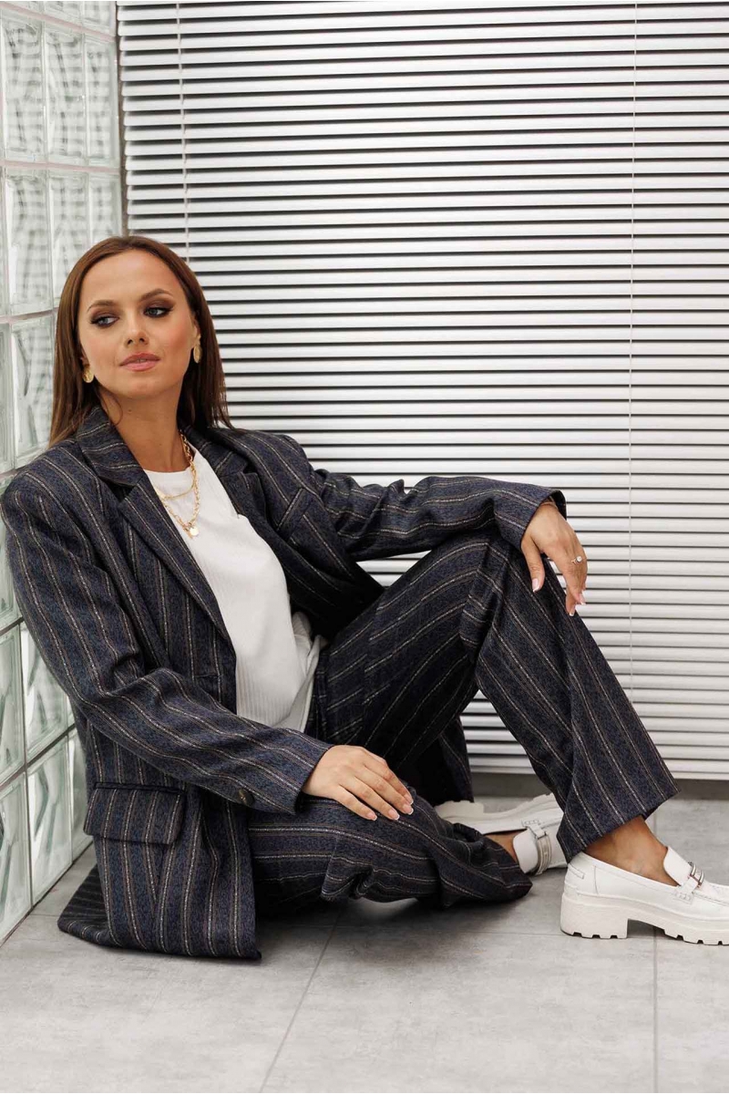Темно-синий костюм в тонкую полоску с пиджаком и прямыми брюками — идеальный офисный сет.