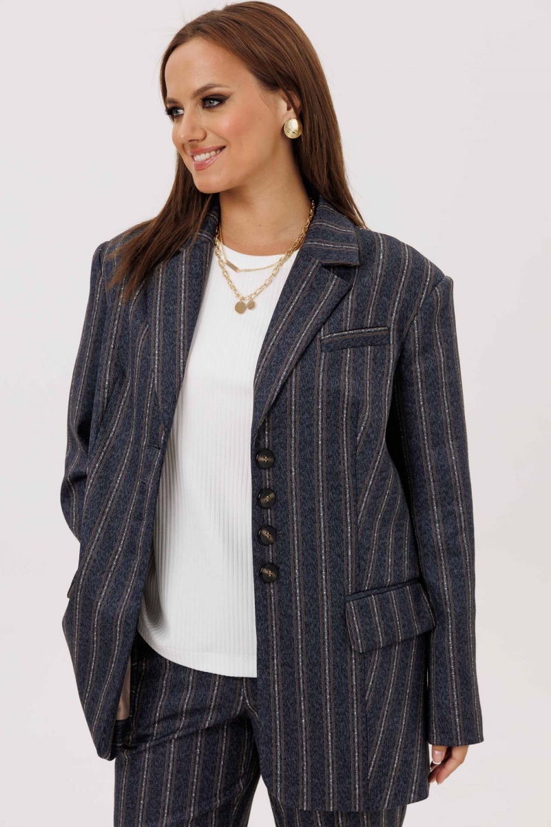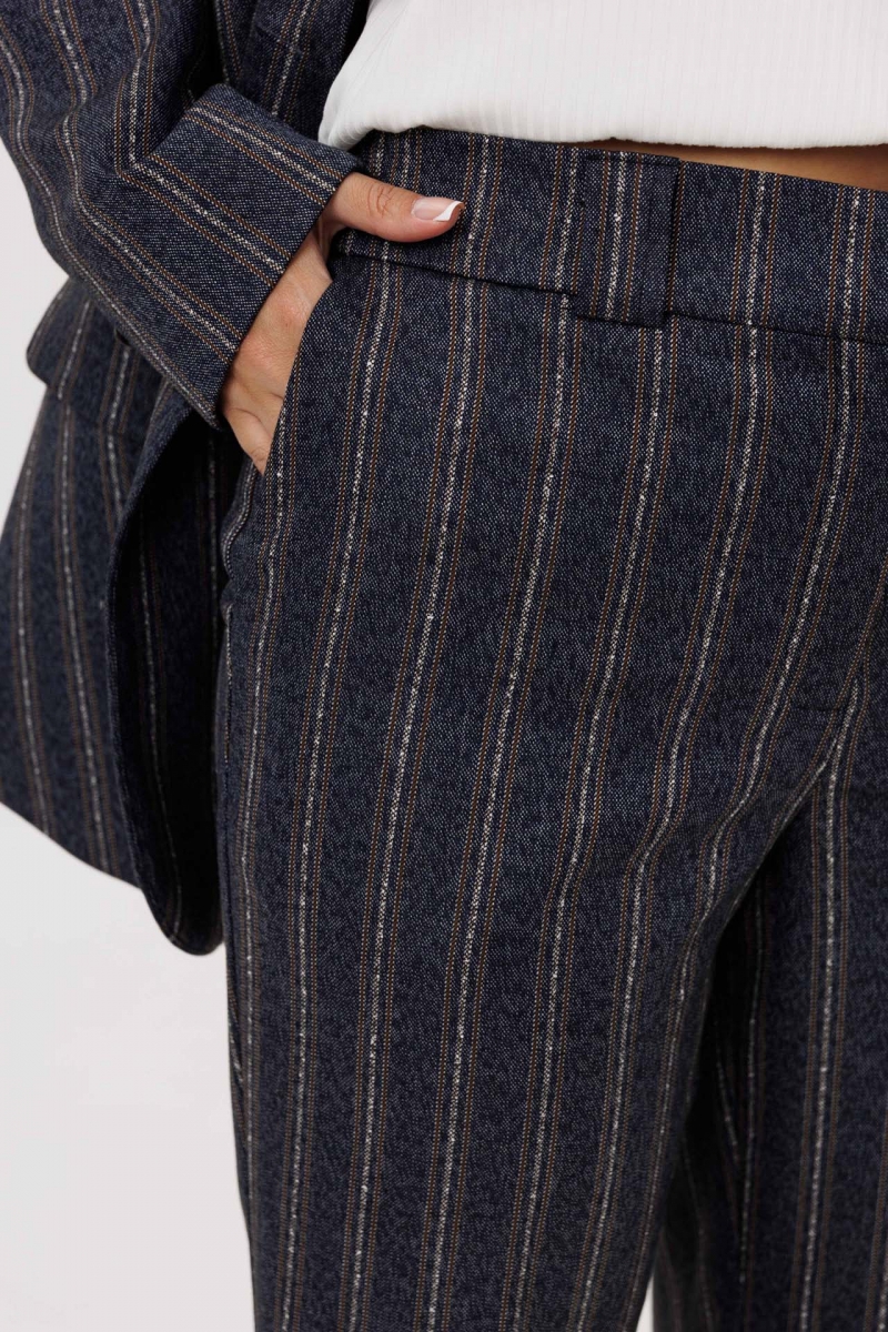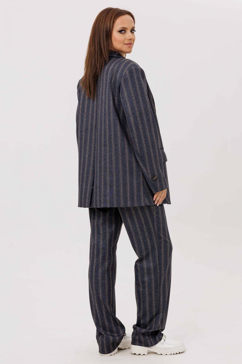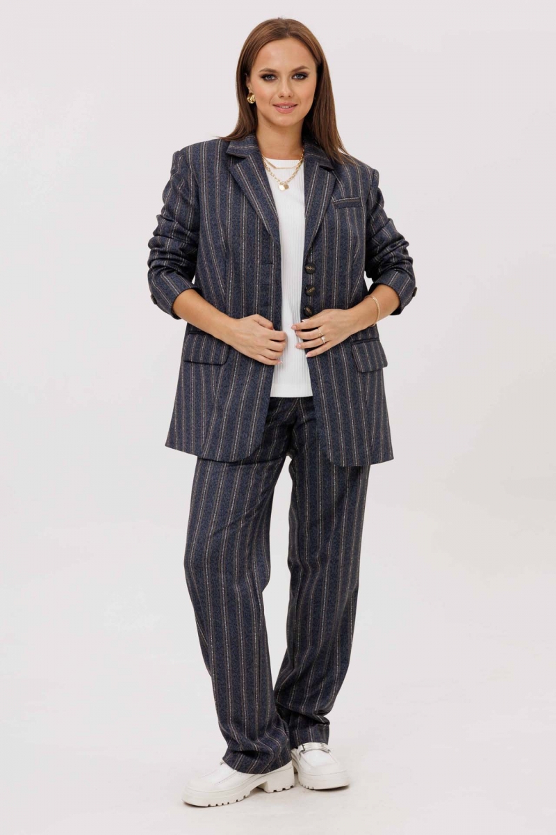 Темно-синий костюм в тонкую полоску с пиджаком и прямыми брюками — идеальный офисный сет.