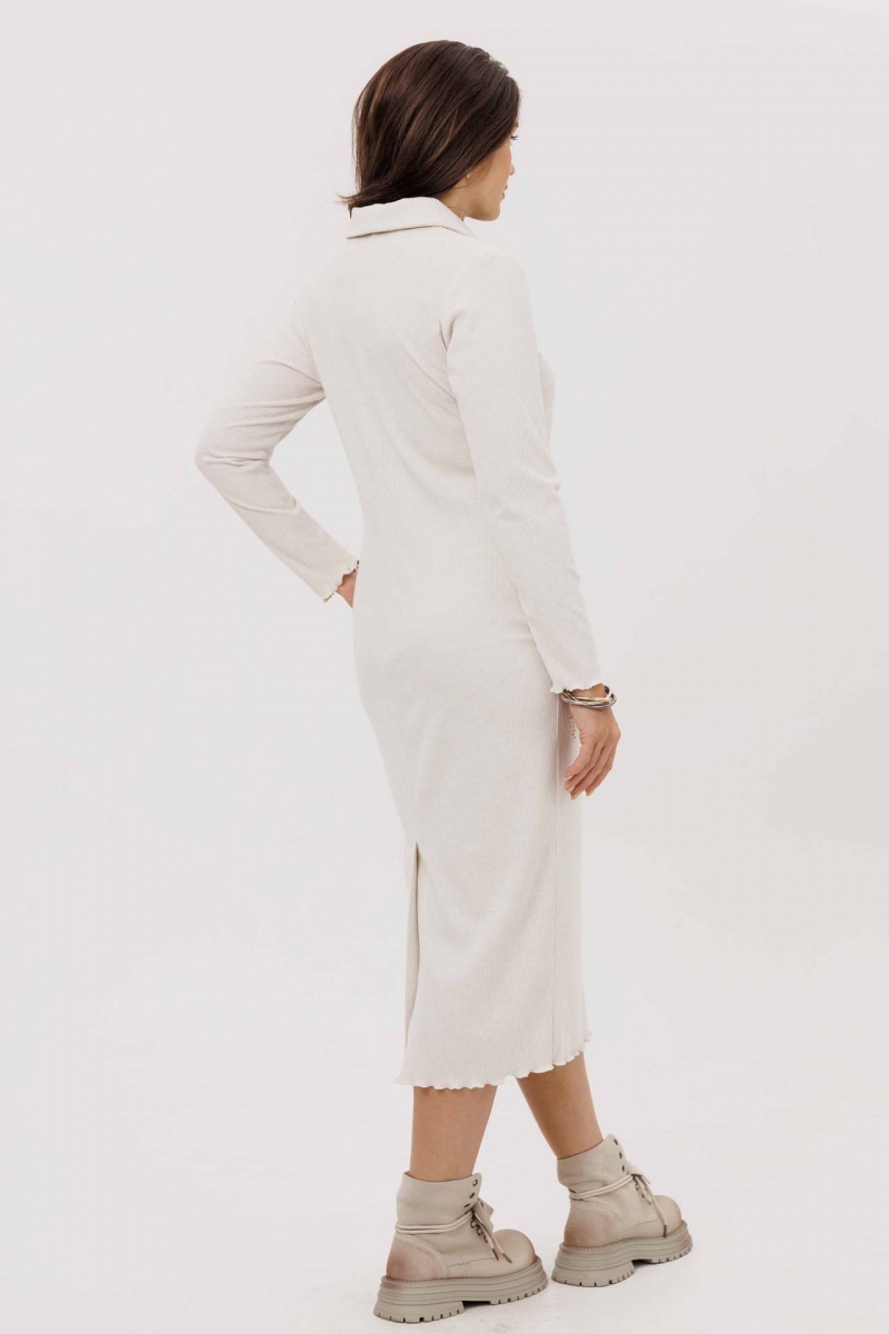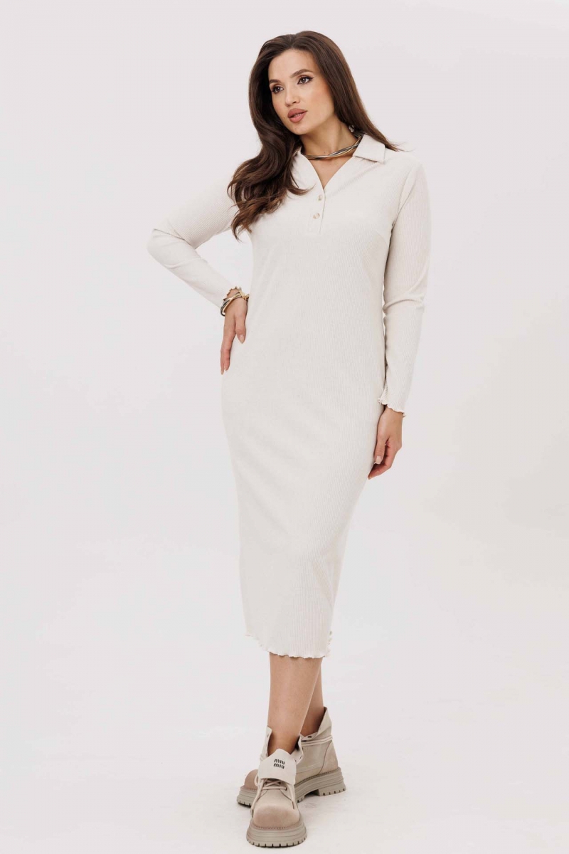 Уютное бежевое платье миди с мягкой вязкой и длинными рукавами. Стиль и тепло в одном.
