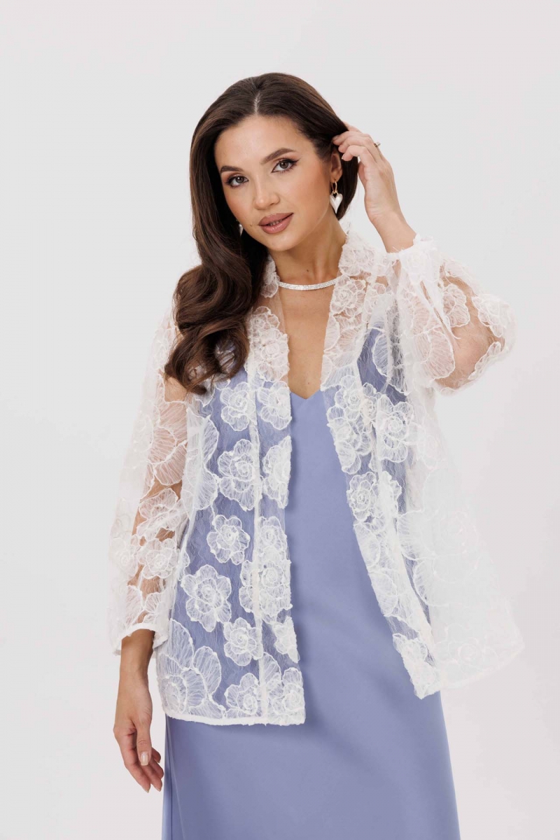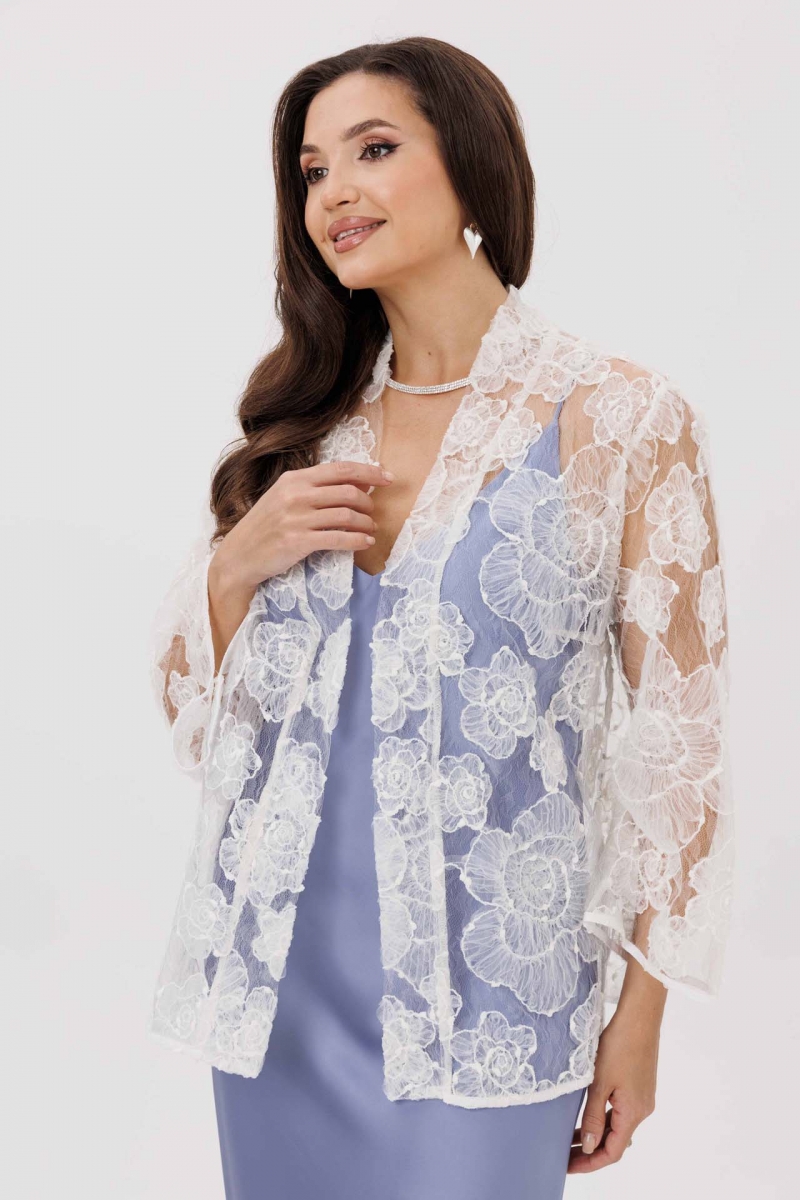 Комплект женский, состоит из жакета(кимоно) и платья-комбинации. Блуза кружевная, свободная без застёжки с притачной планкой, переходящей в стойку. По переду нагрудные вытачки. Платье полуприлегающего силуэта, расклешенное к низу. Перед с нагрудными вытачками. Платье на нерегулируемых бретелях. Верх платья на обтачке. Дополняет модель тонкий пояс.