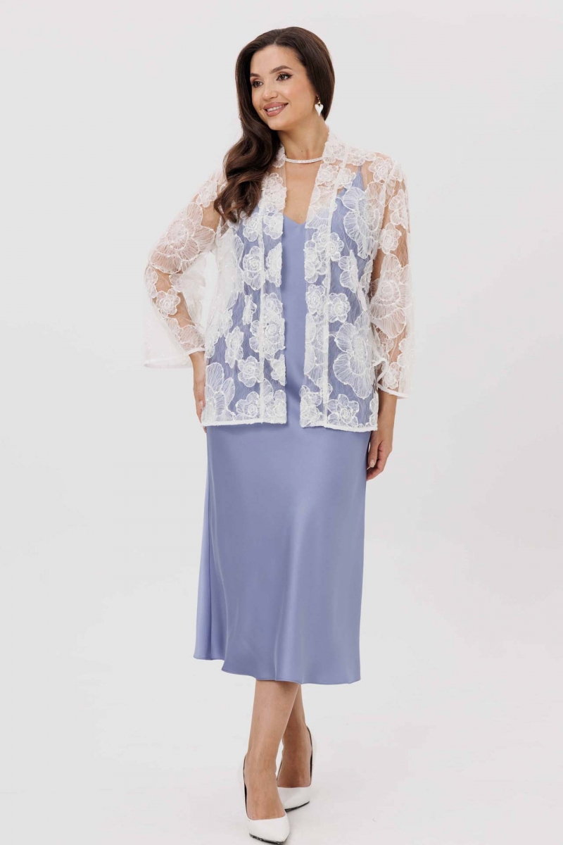 Элегантное голубое платье в комплекте с кружевным жакетом молочного оттенка.