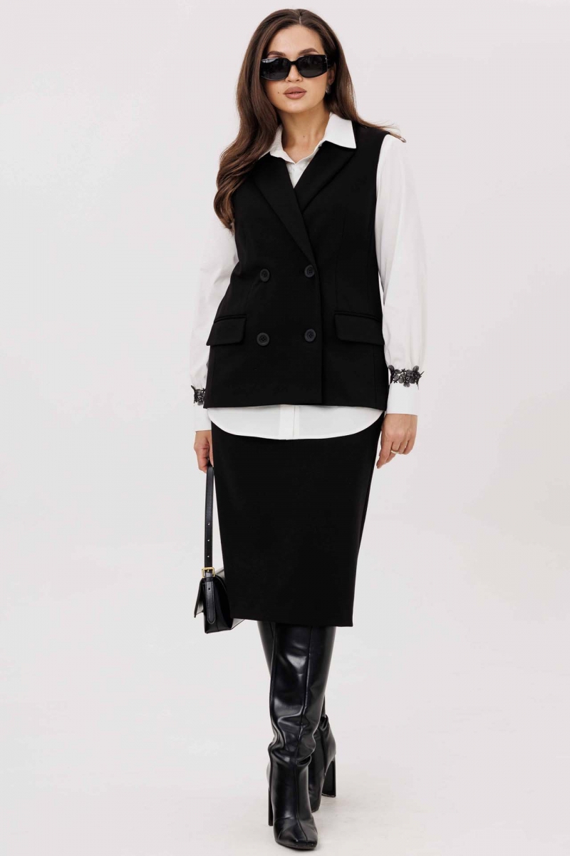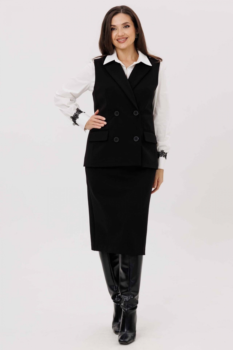 Классический черный жилет и юбка с белой рубашкой — универсальный вариант для офиса и деловых встреч.