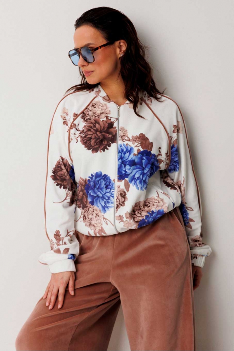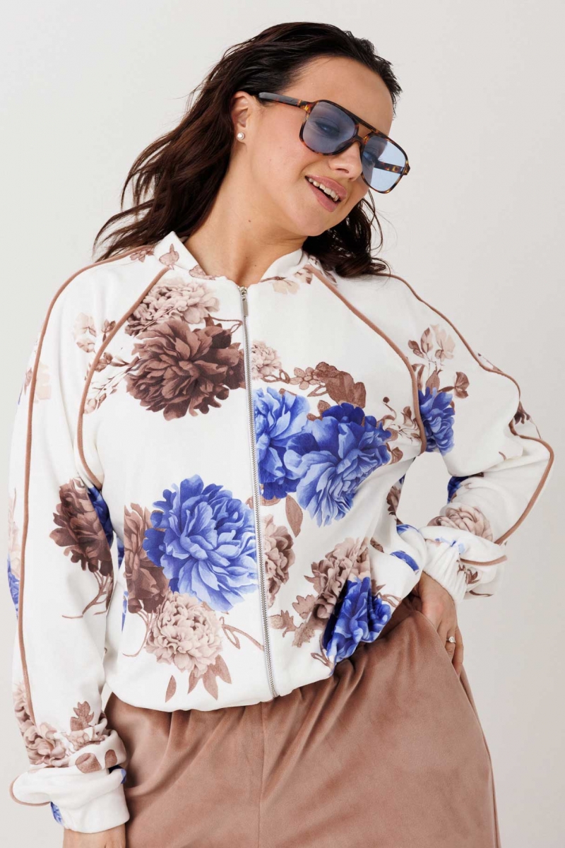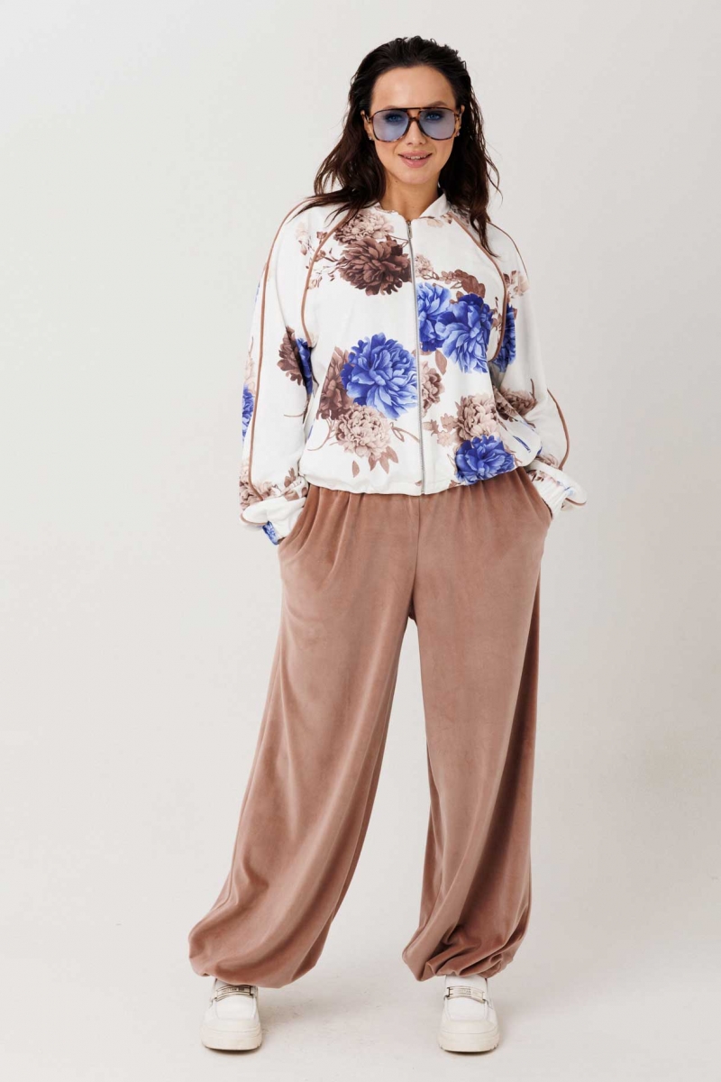 Модель с виним цветочным принтом ориентирована на покупательниц, ценящих комфорт и актуальный relaxed-силуэт. Велюровая текстура добавляет изделию мягкий блеск и аккуратную посадку.