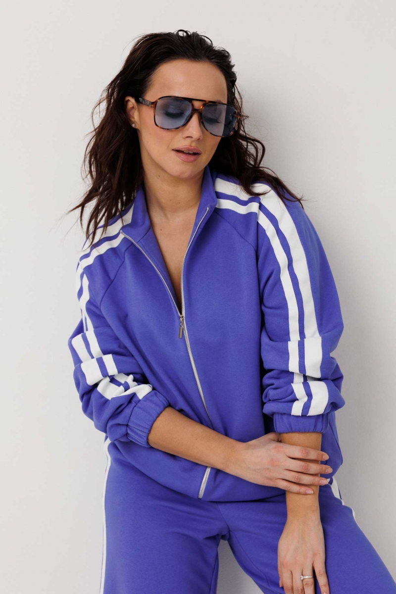 Синий костюм с лампасами формирует динамичный и современный образ. Классический спортивный крой в сочетании с хлопковой тканью делает модель практичной и востребованной для ежедневной носки.