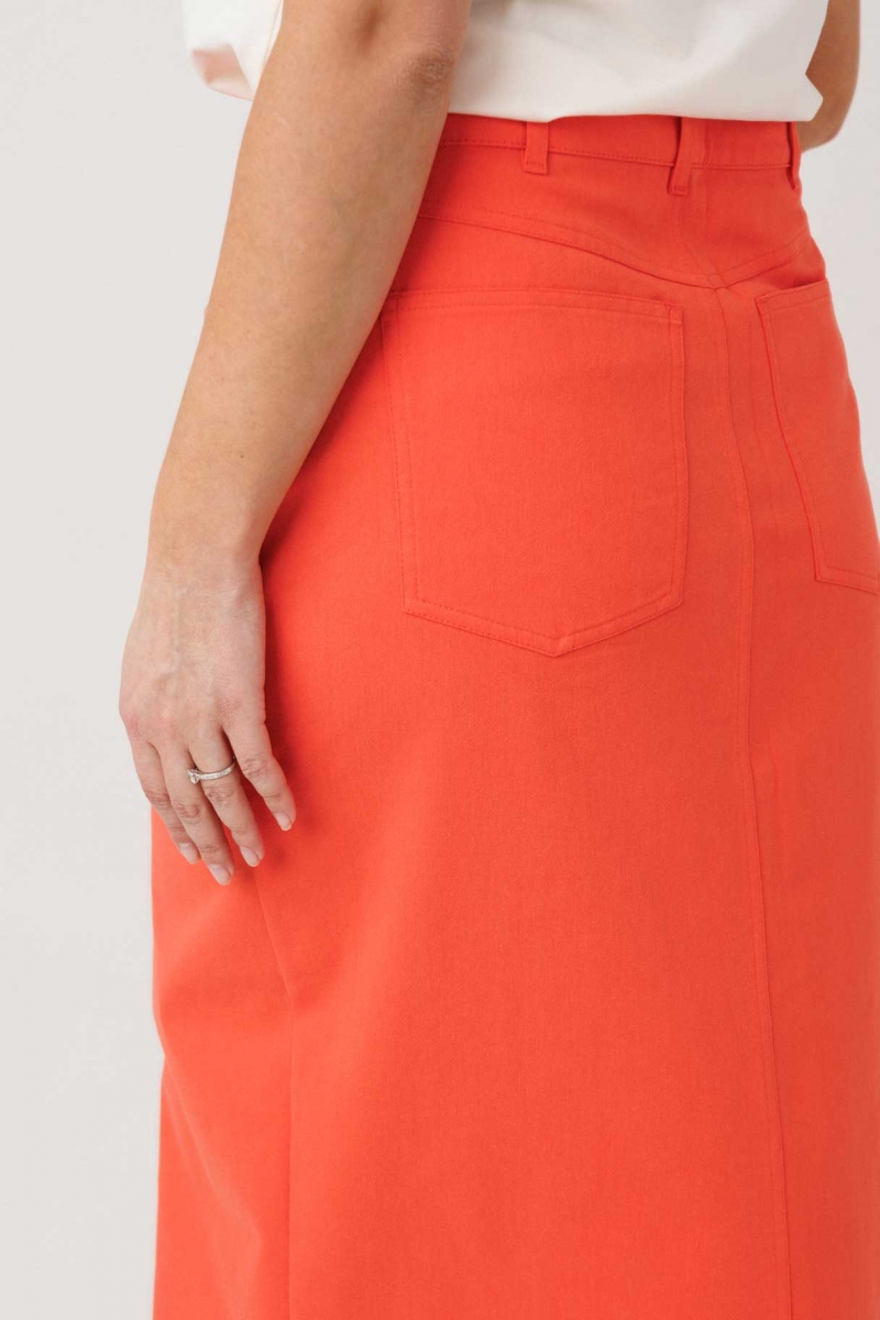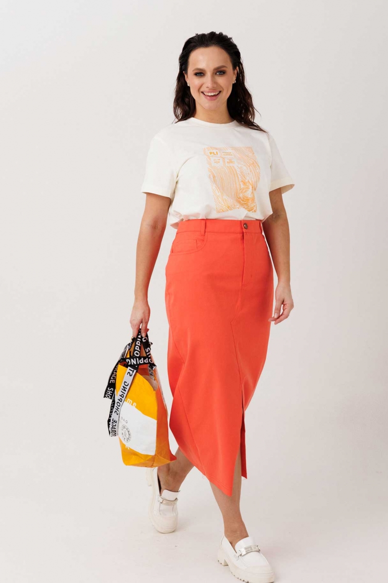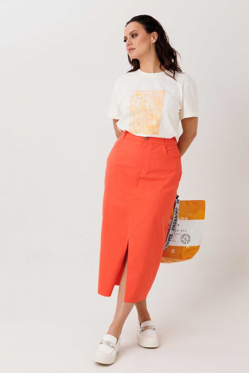 Юбка женская слегка зауженная к низу на притачном поясе со шлёвками, который застёгивается на прорезную петлю и пуговицу. По переду фигурный подрез заканчивается разрезом, застёжка на молнию с гульфиком и откоском и карманы. По спинке центральный шов, кокетка и накладные карманы. Юбка без подкладки. Украшают юбку двойные отделочные строчки