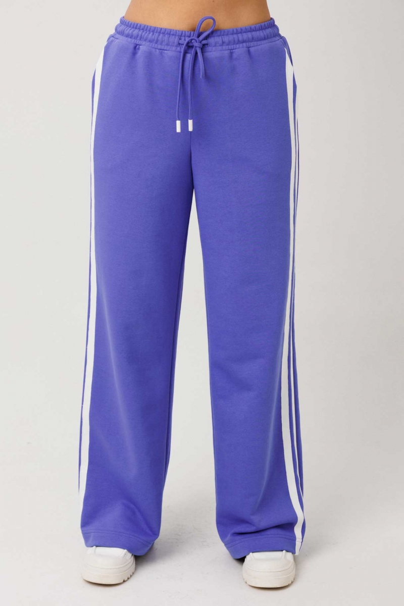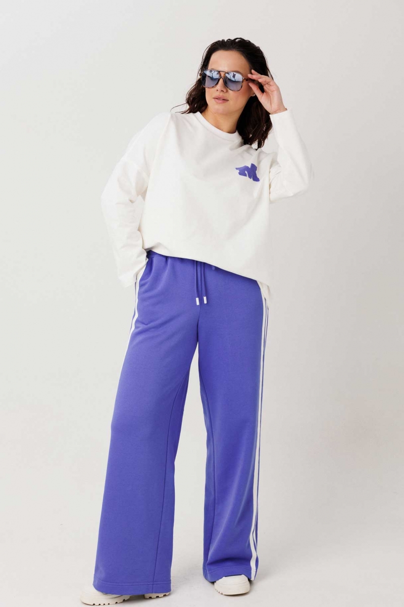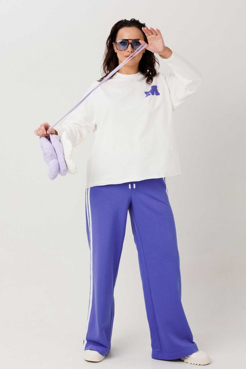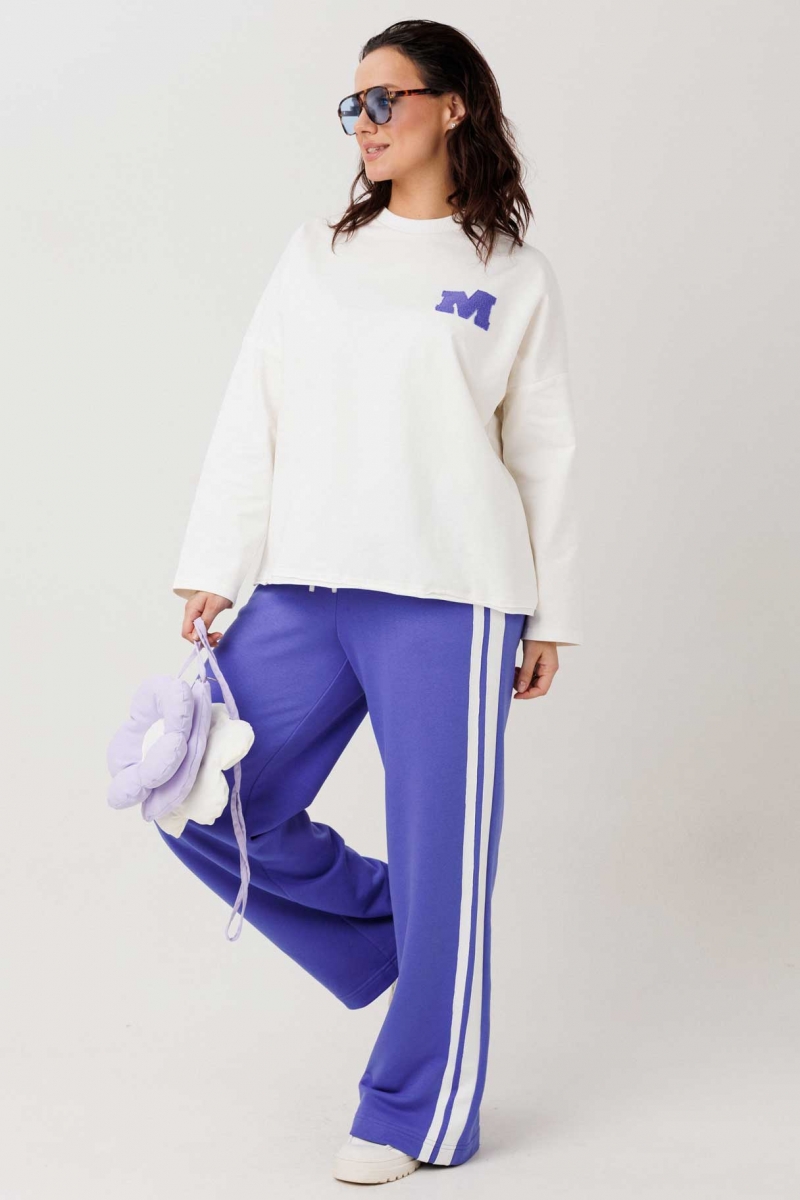 Женский спортивный костюм бело/синий оптом от производителя. Состав 95% вискоза, 5% спандекс. Свободный джемпер со спущенным плечом, горловина с довязом, декоративная тесьма с эффектом «трепки», аппликация «М». Брюки на резинке с завязкой. Женская одежда оптом, спортивные костюмы оптом, трикотаж оптом, одежда больших размеров от фабрики.