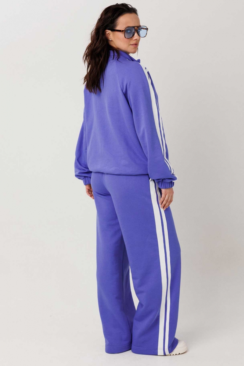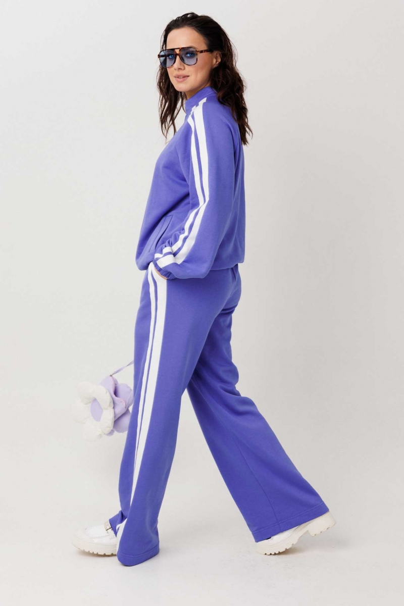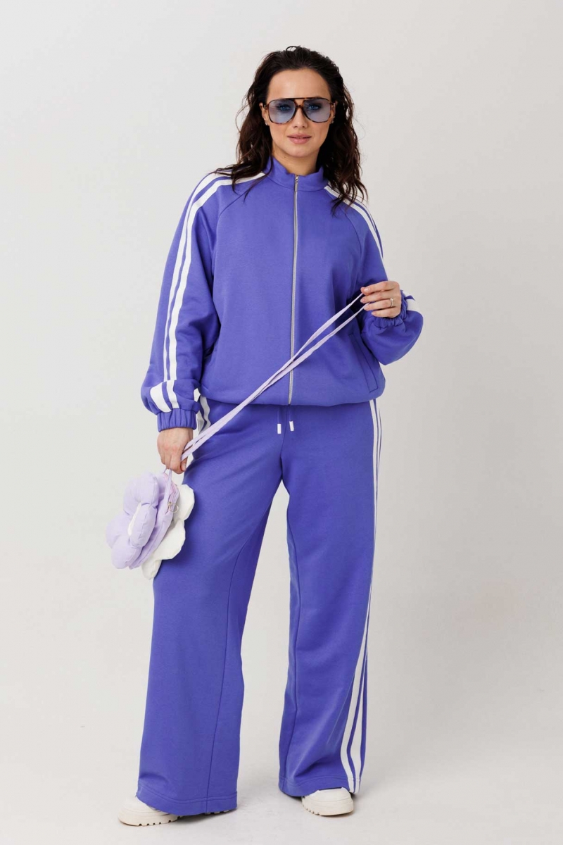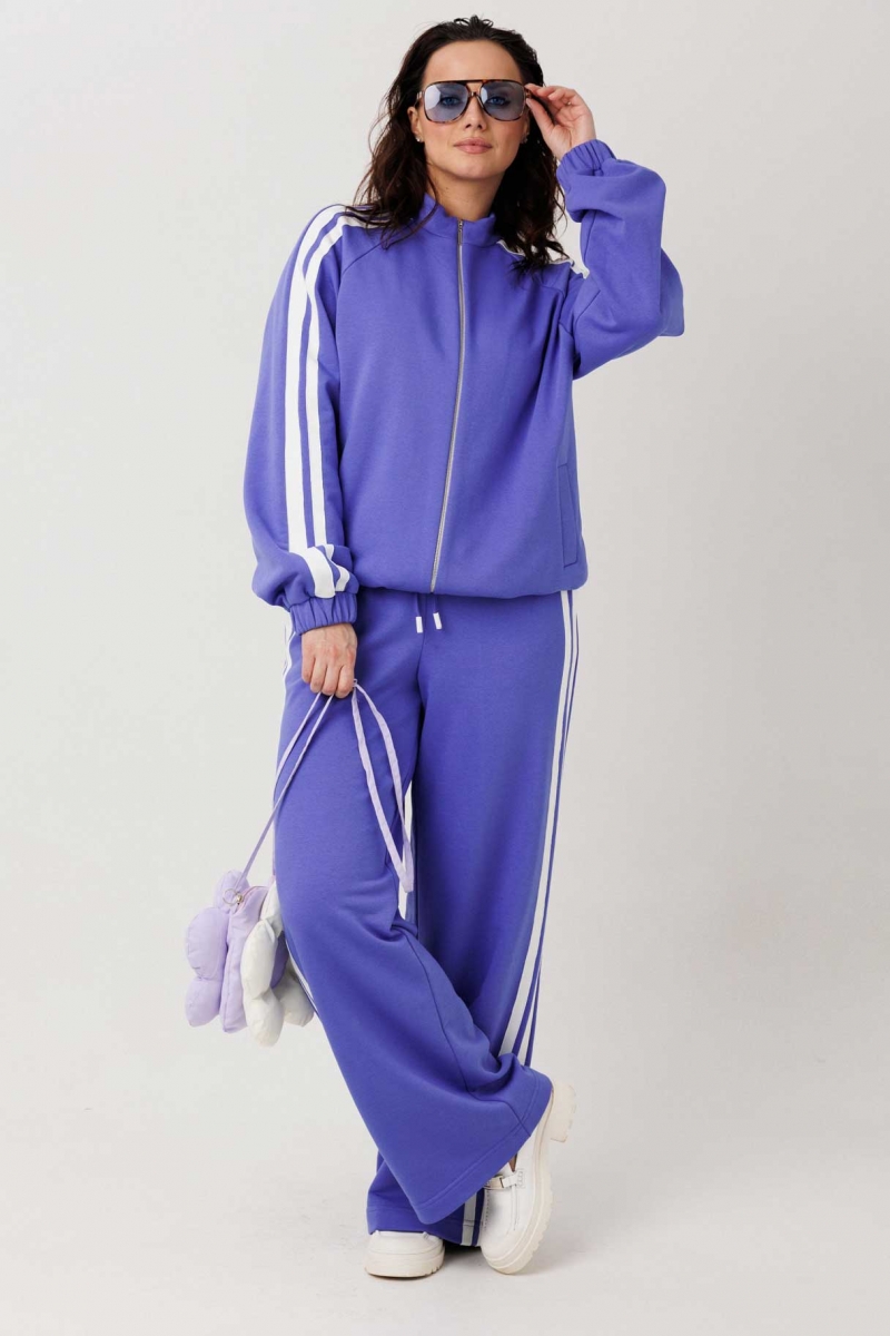 Костюм состоит из джемпера на молнии и брюк прямого силуэта с лампасами.