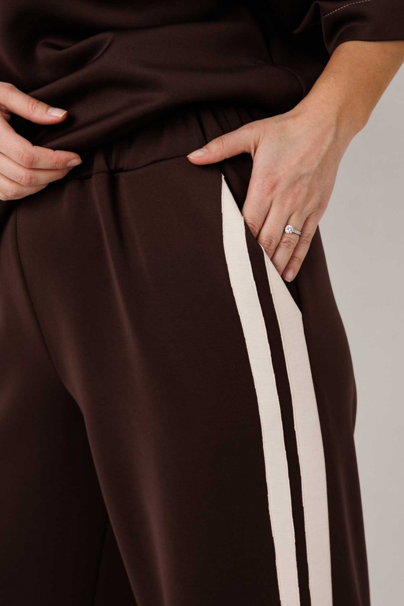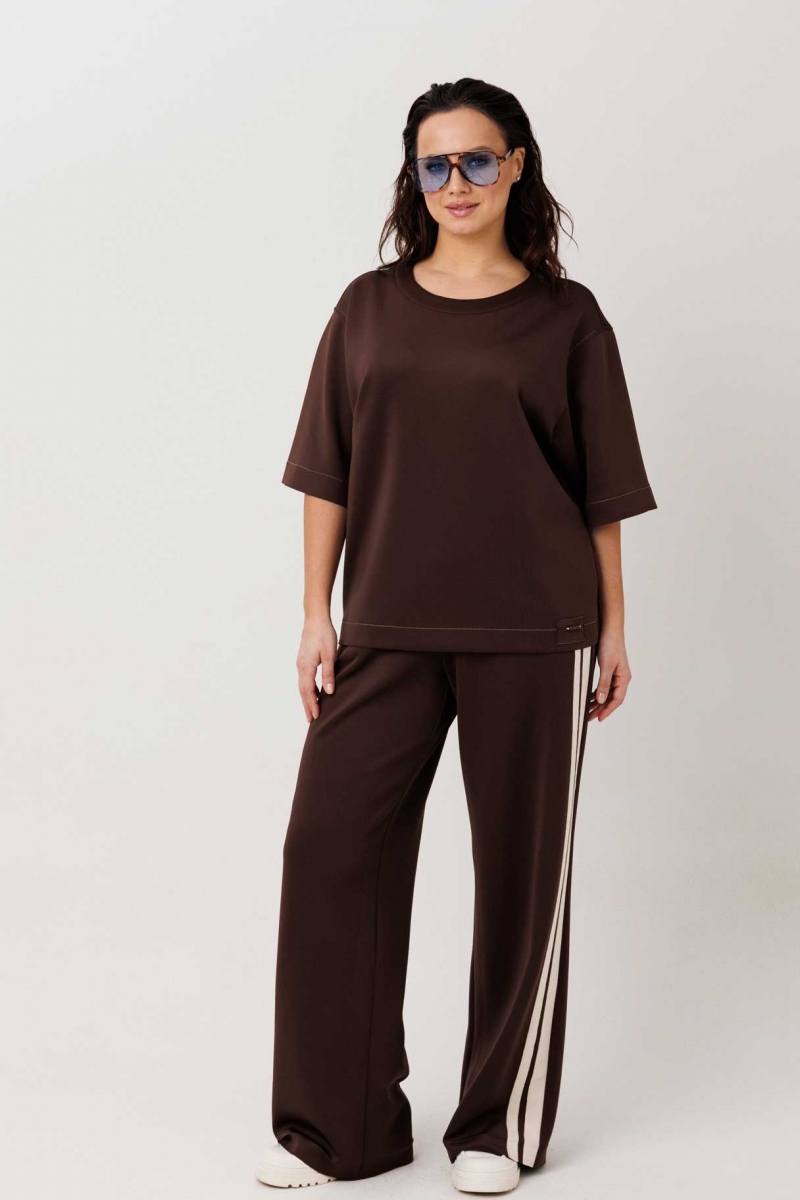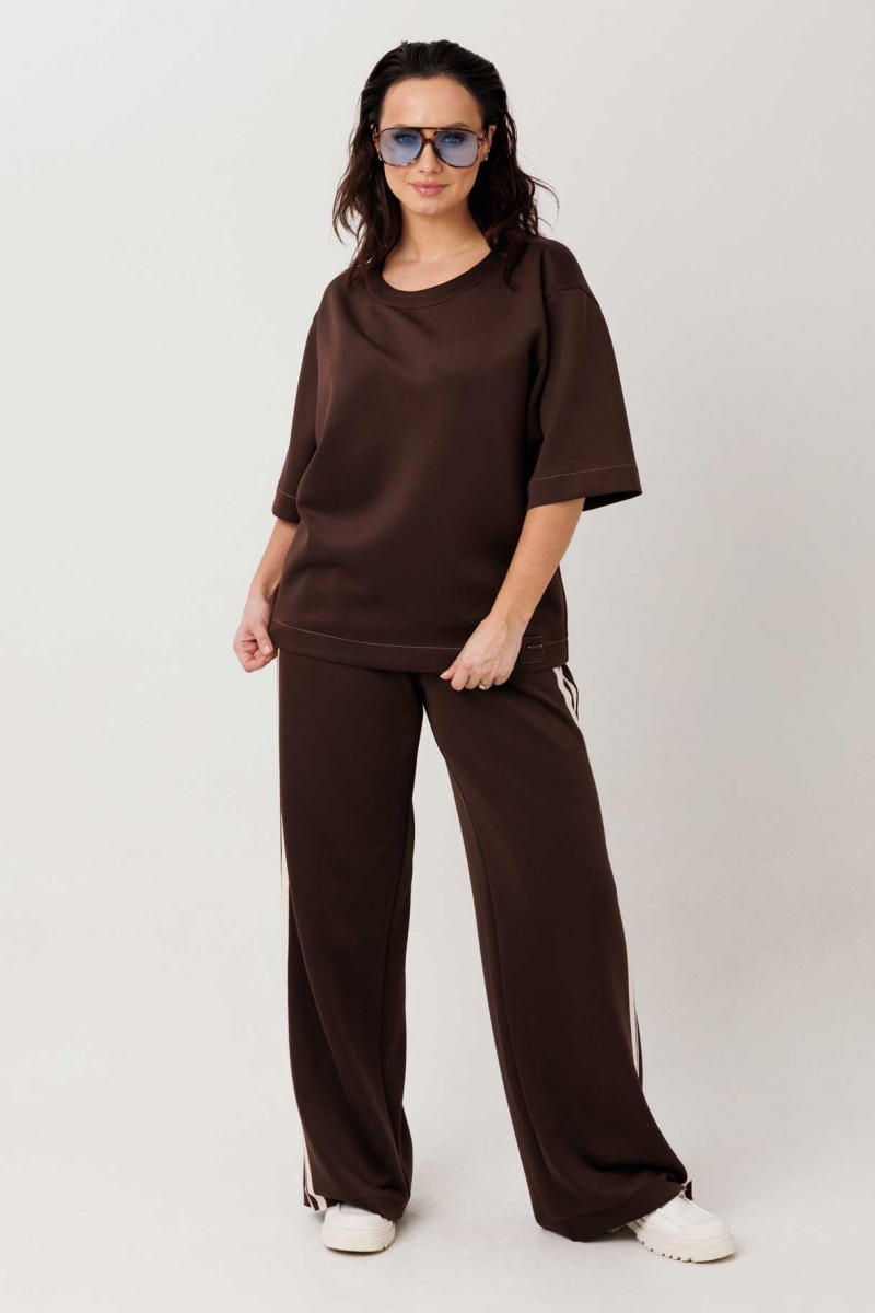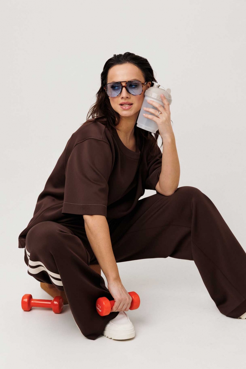 Костюм в цвете шоколад сочетает комфорт спортивного стиля и актуальный силуэт брюк палаццо. Свободная блуза и струящиеся брюки формируют расслабленный, современный образ.