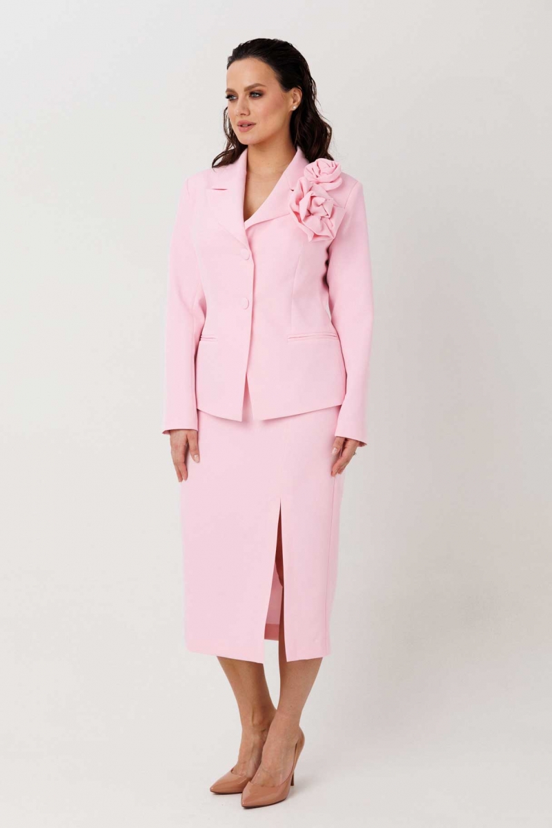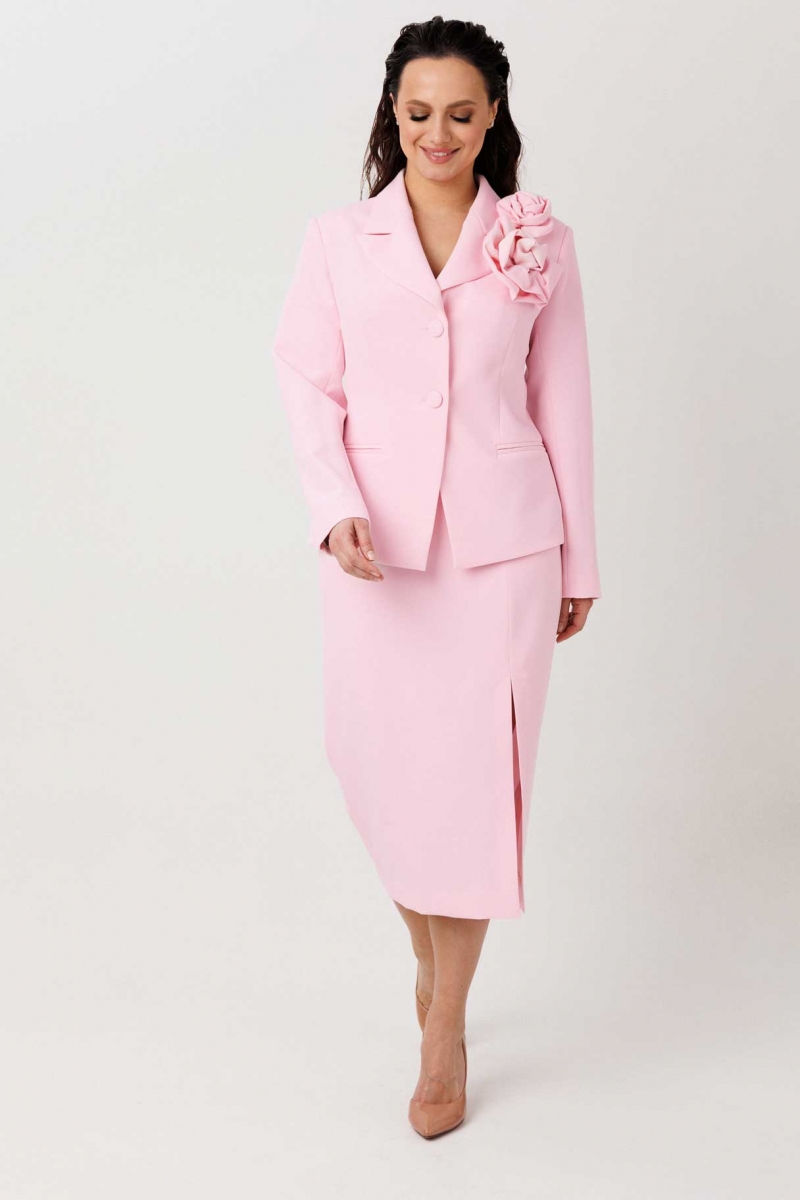 Элегантный женский костюм-двойка с юбкой — идеальный выбор для делового гардероба, торжественного мероприятия или стильного повседневного образа. Классический крой в сочетании с выразительными деталями делает модель универсальной и современной.