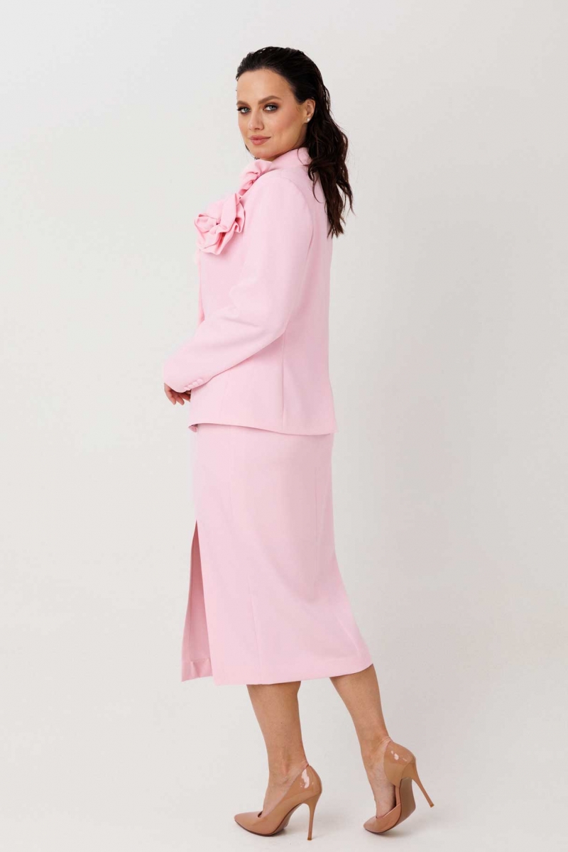 Жакет на подкладке застегивается на две пуговицы, формируя аккуратный силуэт и подчеркивая линию талии. Рукава дополнены четырьмя декоративными пуговицами. Главный акцент — объемные съемные цветы, которые позволяют менять настроение образа: от сдержанного делового до нарядного и акцентного.