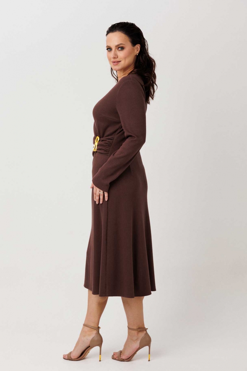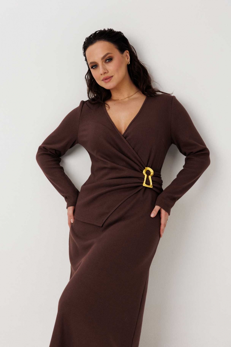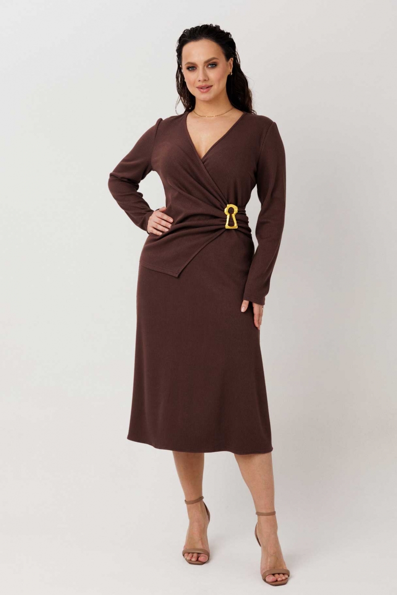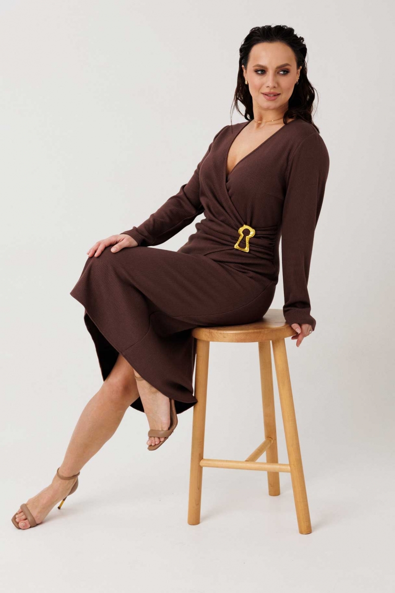 Трикотажное платье на запах с твист-деталью и брошь-булавкой (шоколадное)