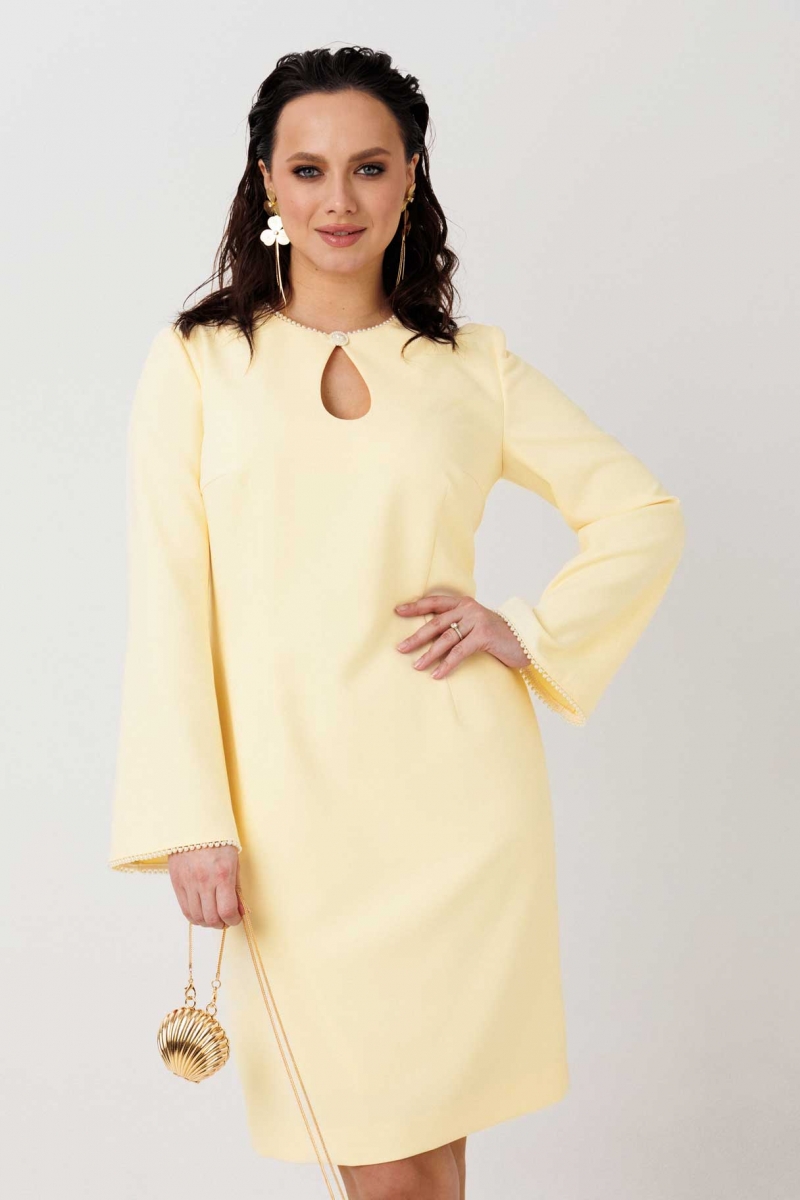 Солнечное желтое платье — эффектная и в то же время утонченная модель для яркого, но элегантного образа. Акцентный вырез «капелька» добавляет изящности, а декоративная отделка из жемчужной нити придает образу легкий нарядный характер.