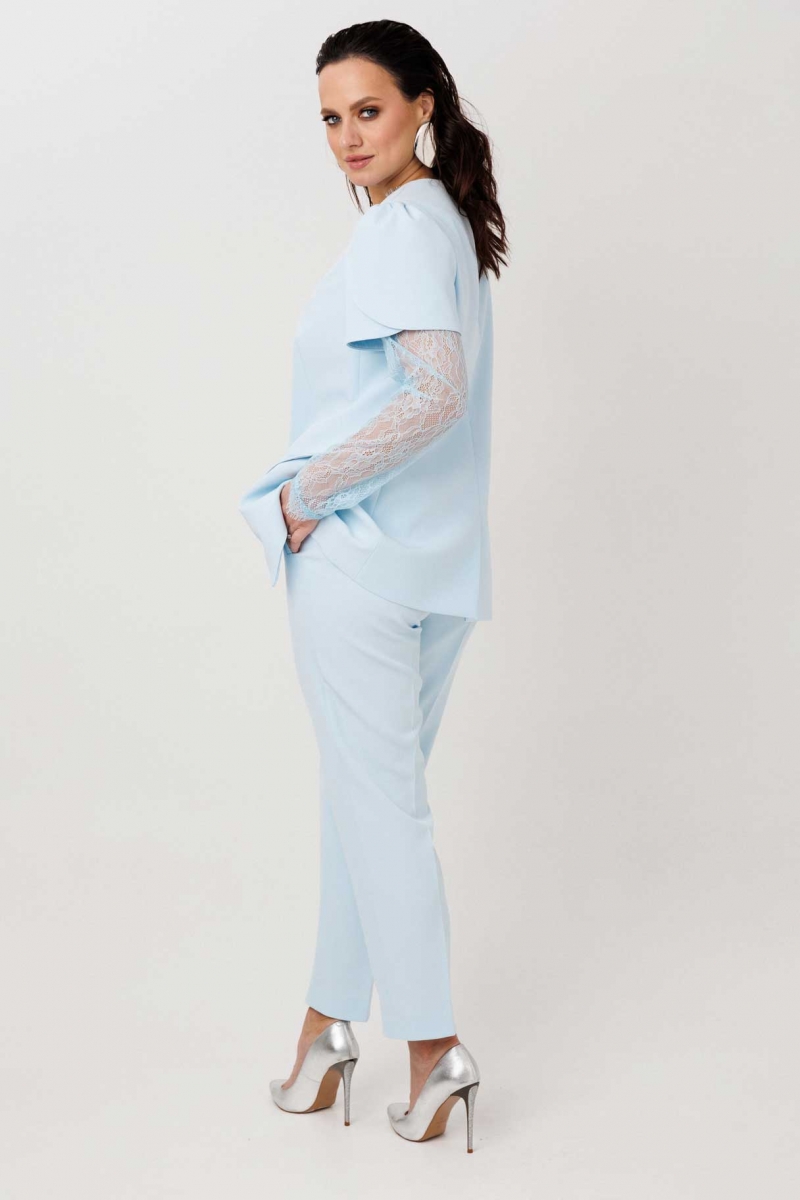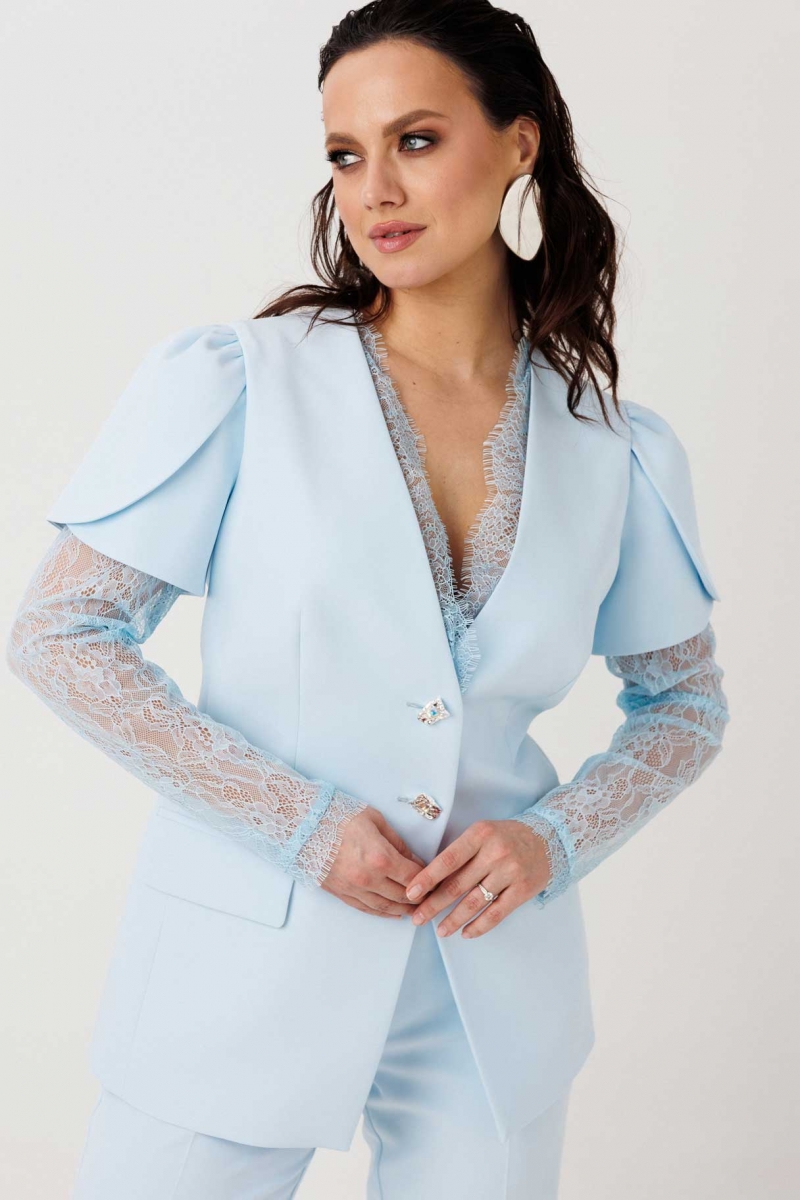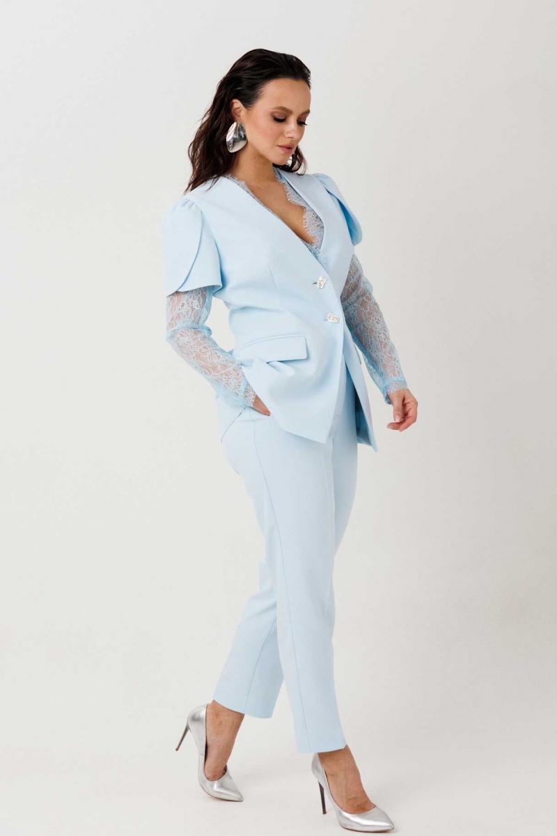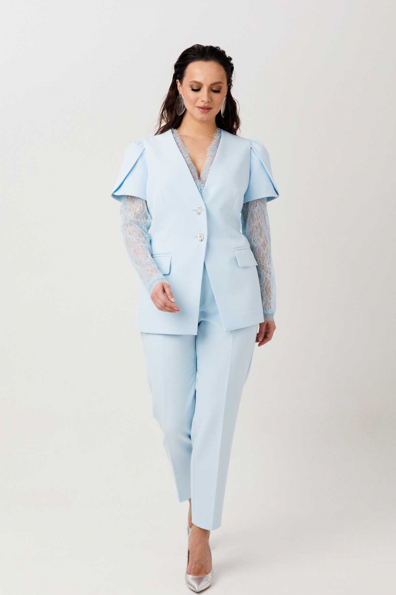 Изящный голубой костюм — это сочетание деловой элегантности и утончённой женственности. Модель притягивает внимание за счёт сложного кроя и декоративной кружевной отделки.