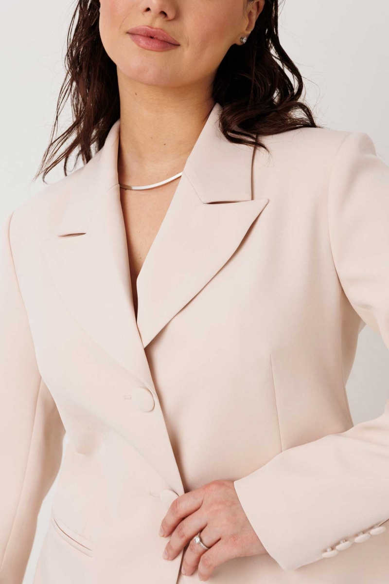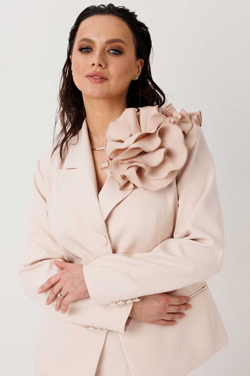 Жакет на подкладке застегивается на две пуговицы, формируя аккуратный силуэт и подчеркивая линию талии. Рукава дополнены четырьмя декоративными пуговицами. Главный акцент — объемные съемные цветы, которые позволяют менять настроение образа: от сдержанного делового до нарядного и акцентного.