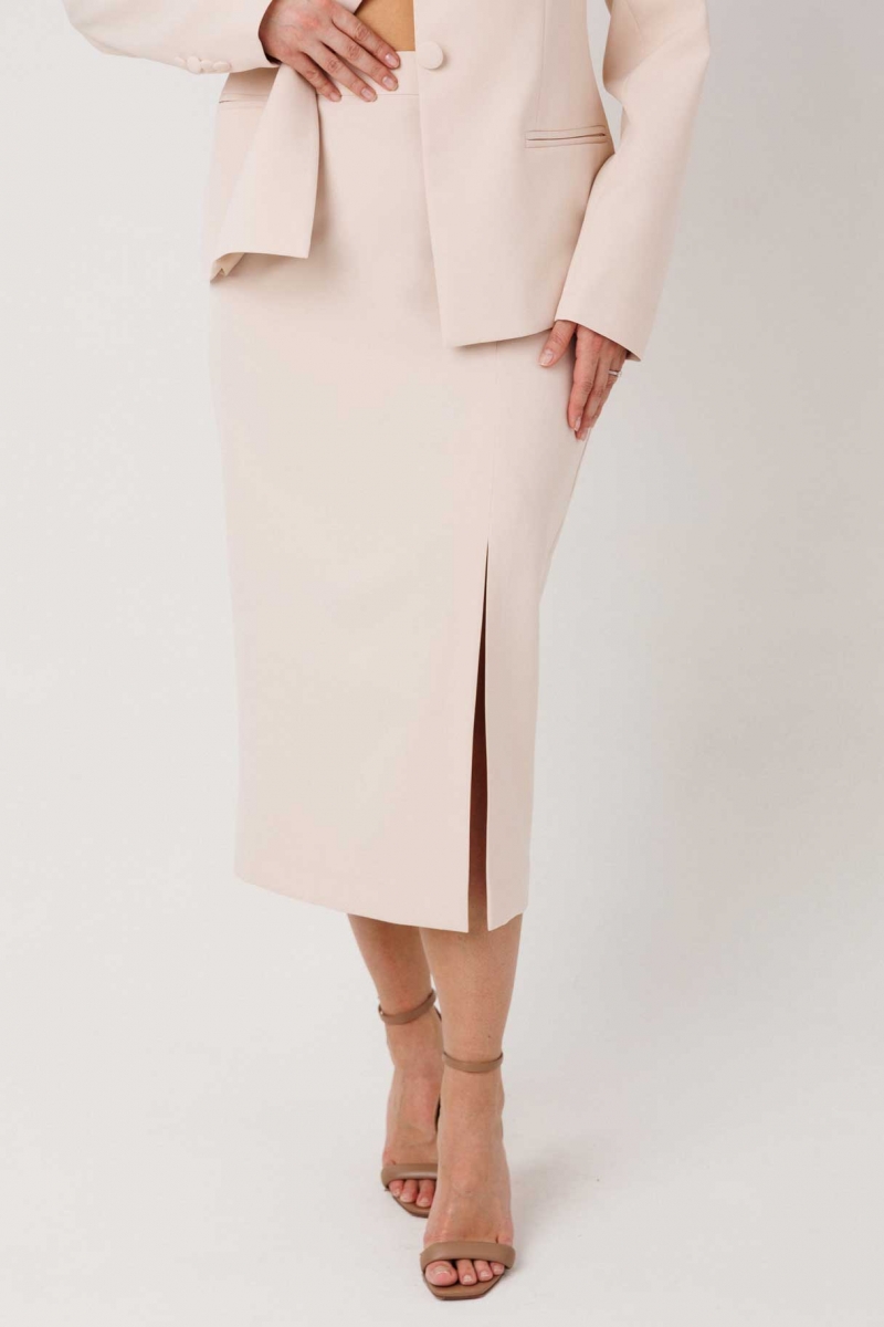 Юбка на подкладке комфортно садится по фигуре, застегивается на молнию сзади и дополнена элегантным разрезом спереди, который добавляет легкости и женственности.
